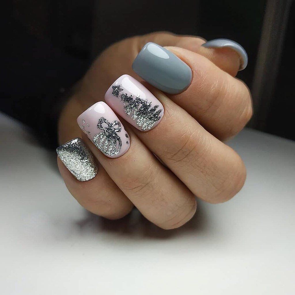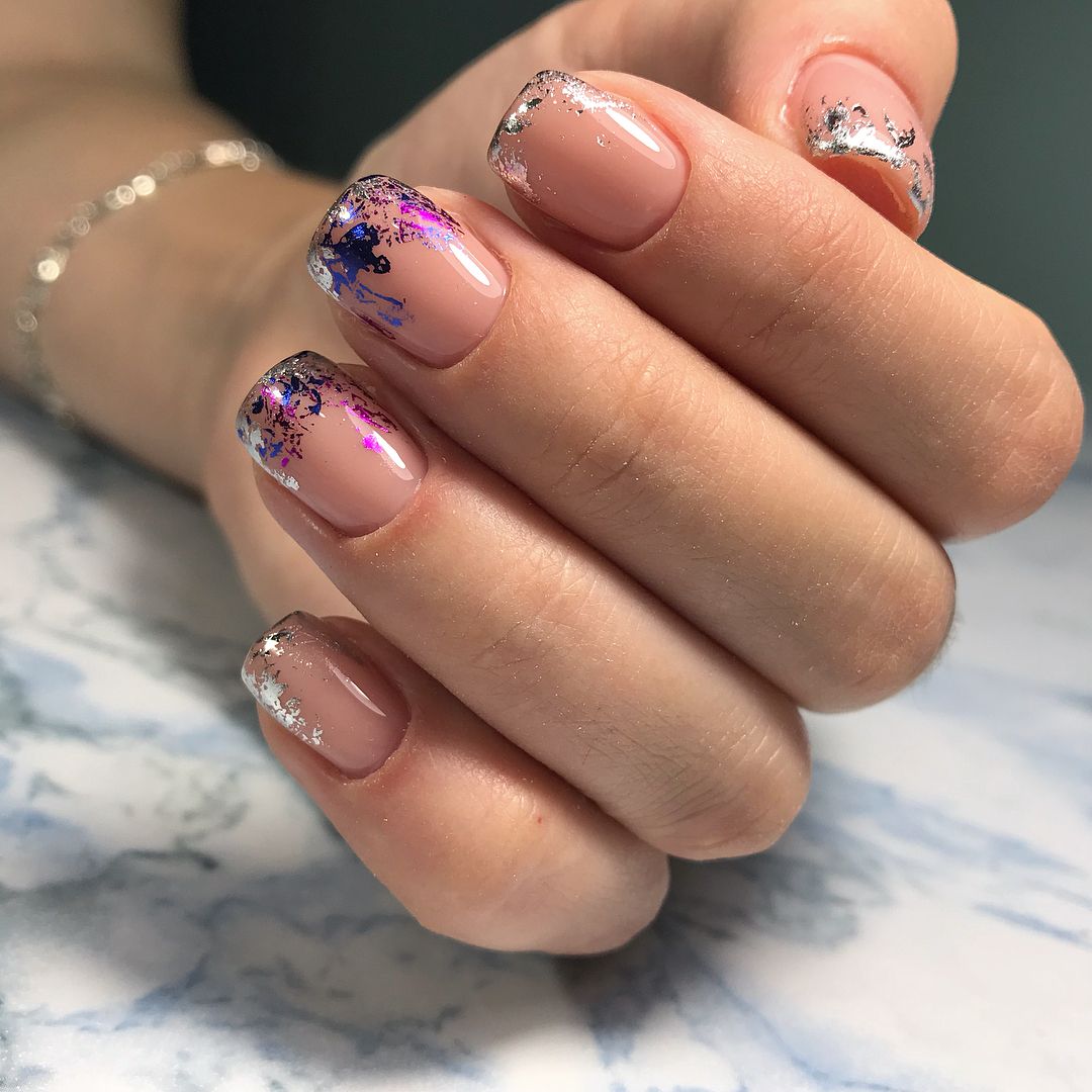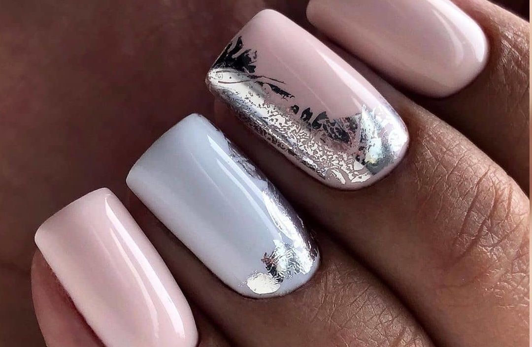 красивый нежный маникюр с серебряной фальгой.