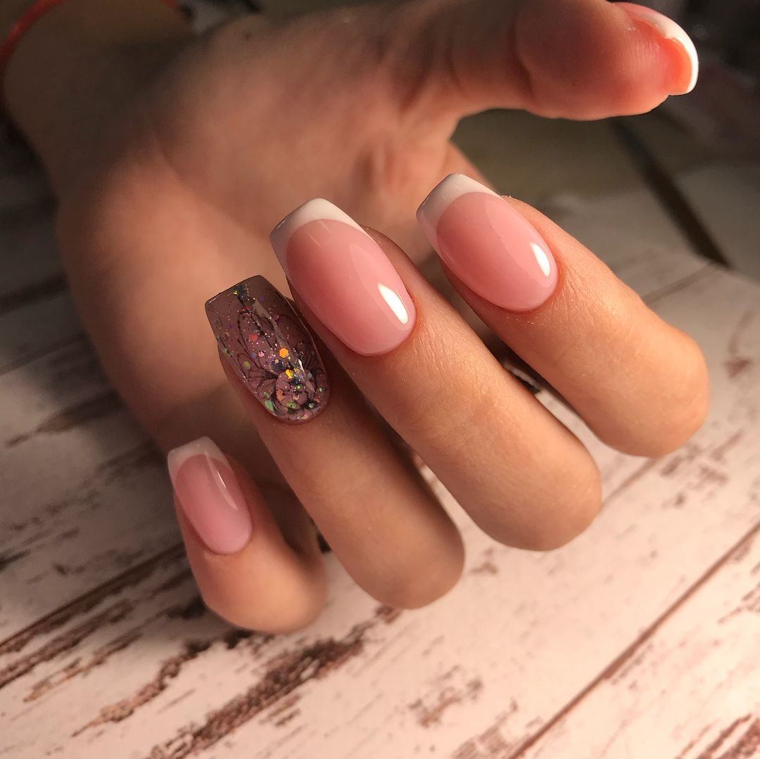 Французский маникюр – это тот редкий вид дизайна, который неплох для длинных ногтей квадратной формы. Однако светлая отросшая зона должна начинаться гораздо выше, чем на самом деле, и быть максимально тонкой. Тогда пальцы приобретут нежный ухоженный вид. Однако стоит отказаться от экстремально длинных ногтей с таким покрытием – 5-6 мм за пределами подушечек будут оптимальны.