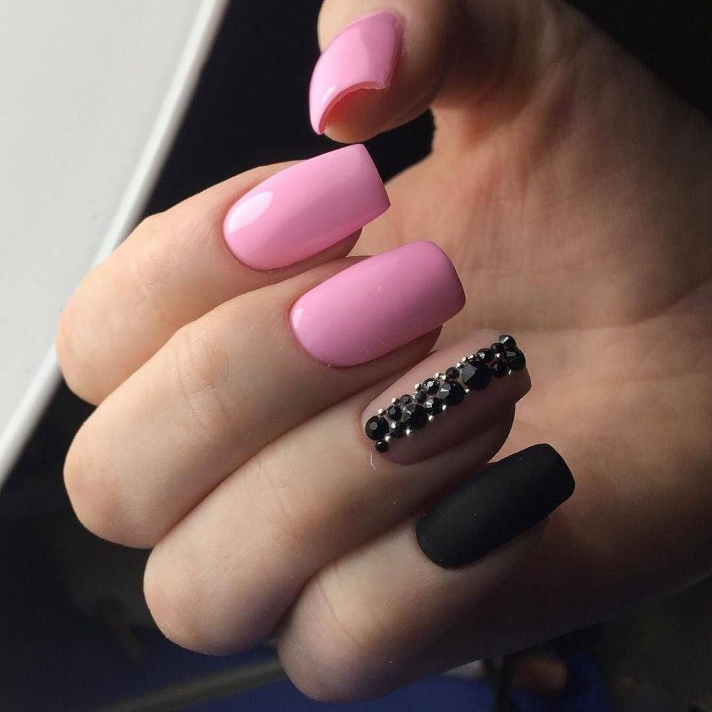 - Чёрный и розовый – идеальное сочетание, которое подчёркивает гламурный стиль обладательницы маникюра. Идеально дополнить такие ногти золотом, серебром, либо сделать матовое покрытие, добавив технику омбре.