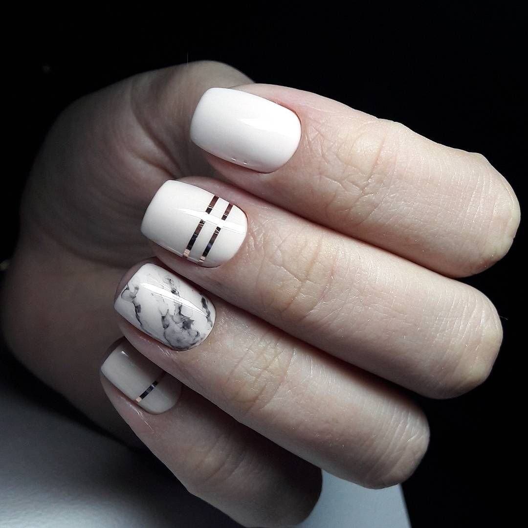 Спокойный маникюр в бежевых тонах и строгим графическим рисунком подойдет для офиса.