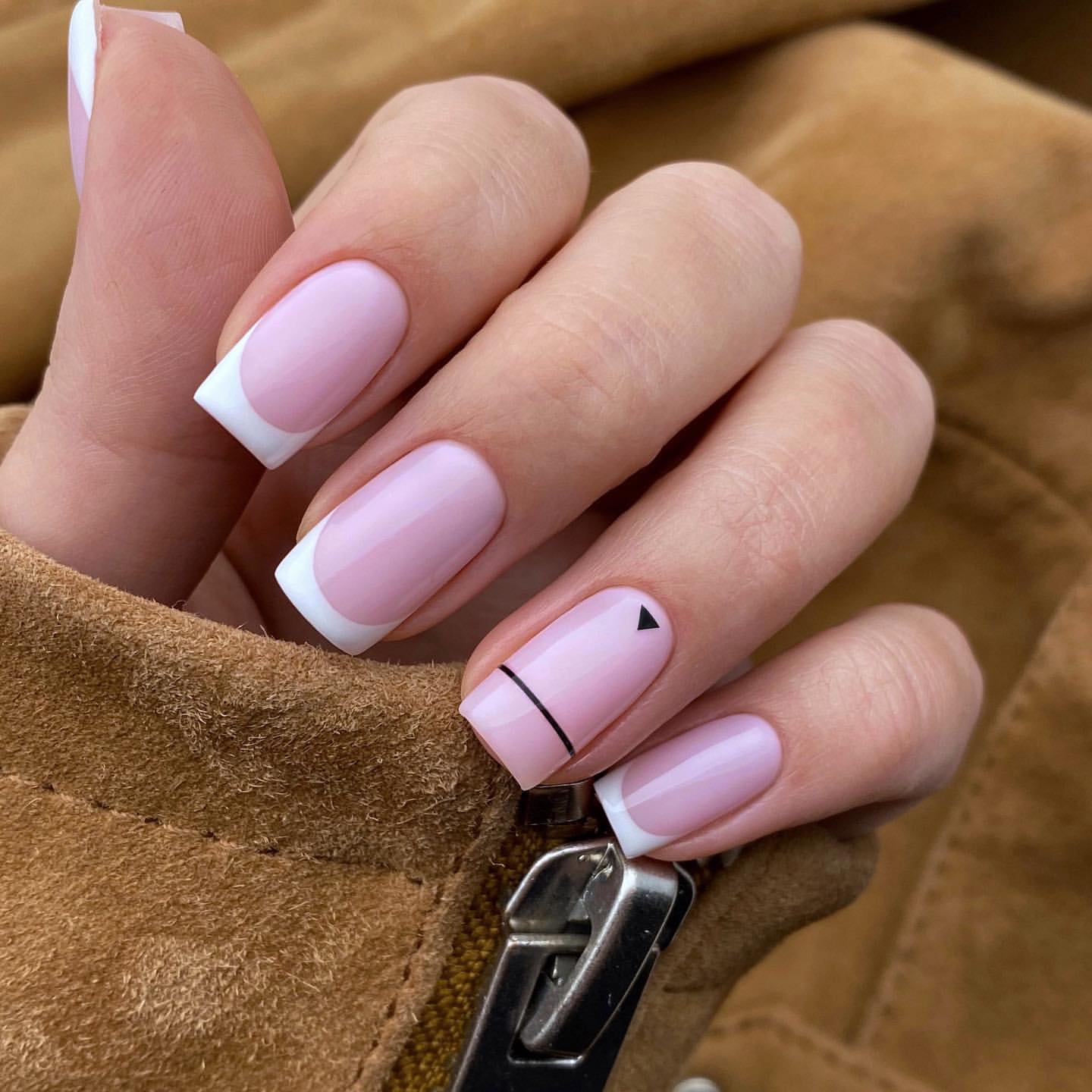Простой френч с черной полоской на одном ногте.