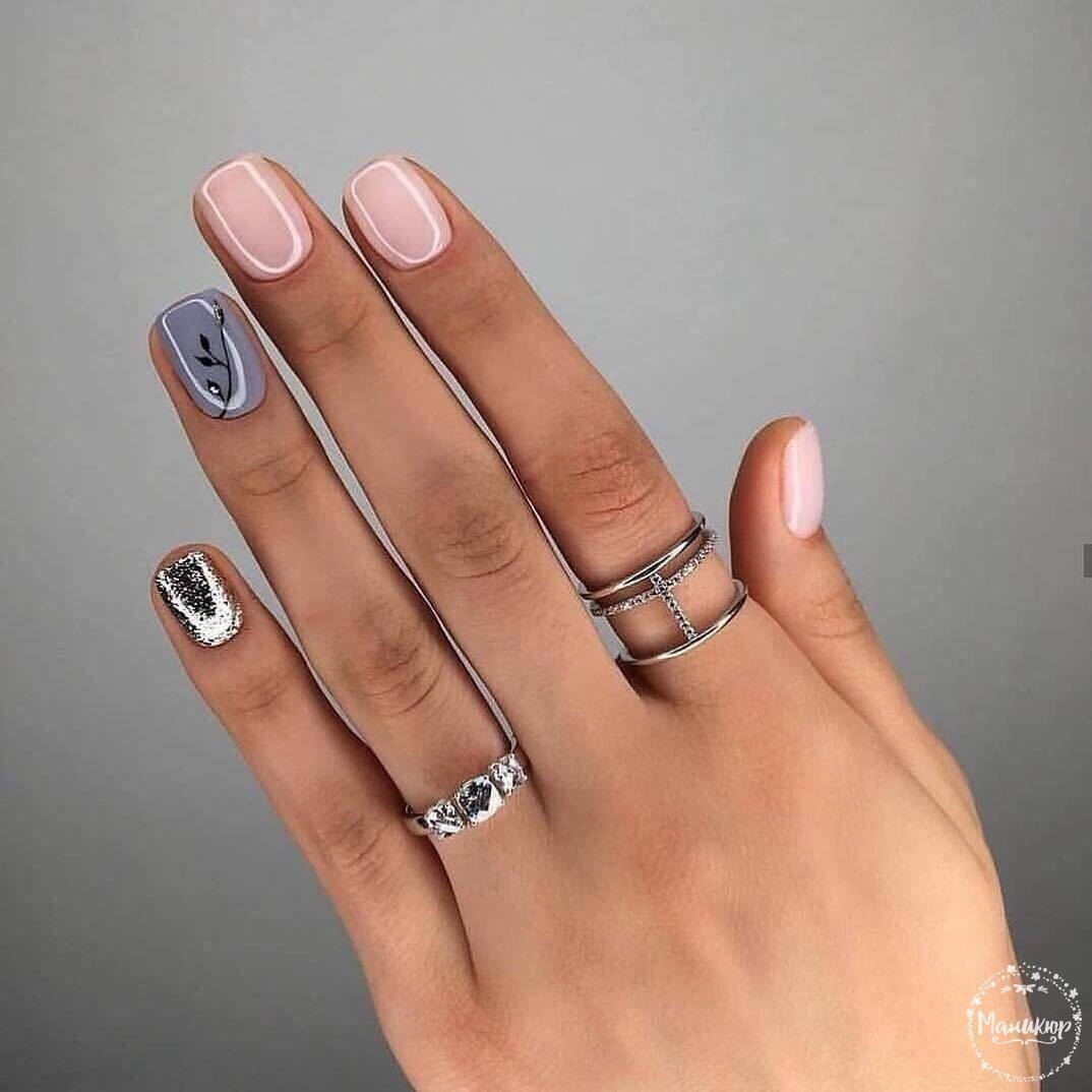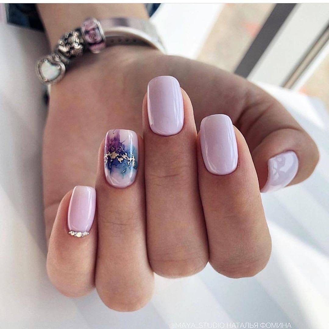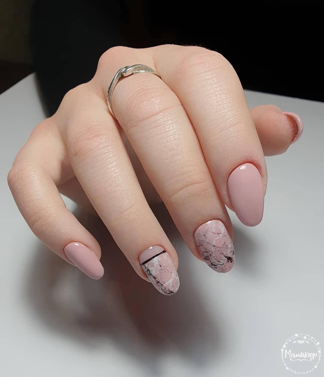 В тренде однотонный маникюр в лиловом, персиковом, бледно-розовом, пастельном розовом цветах. Привлекательно выглядит мраморный маникюр в розовом цвете с вкраплениями шиммера или глиттера. С розовым цветом можно выполнить множество контрастных нейл-артов. Присмотритесь к маникюру с темной флористикой, например, черными веточками и листочками на розовом фоне. Красиво выглядит дизайн, где узор покрыт меланжем или акриловой пудрой.