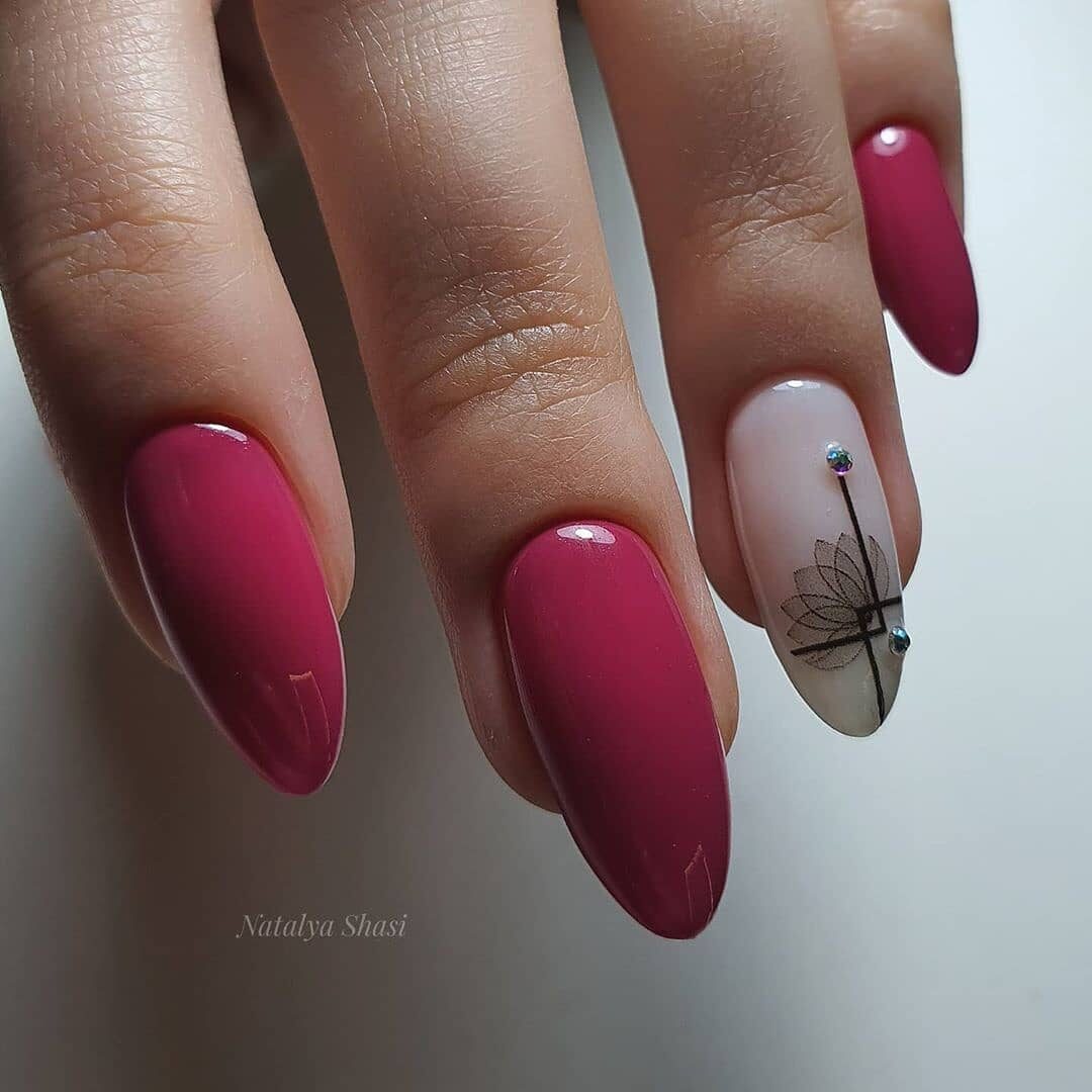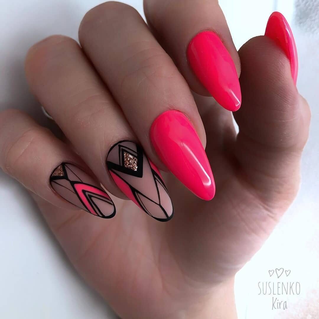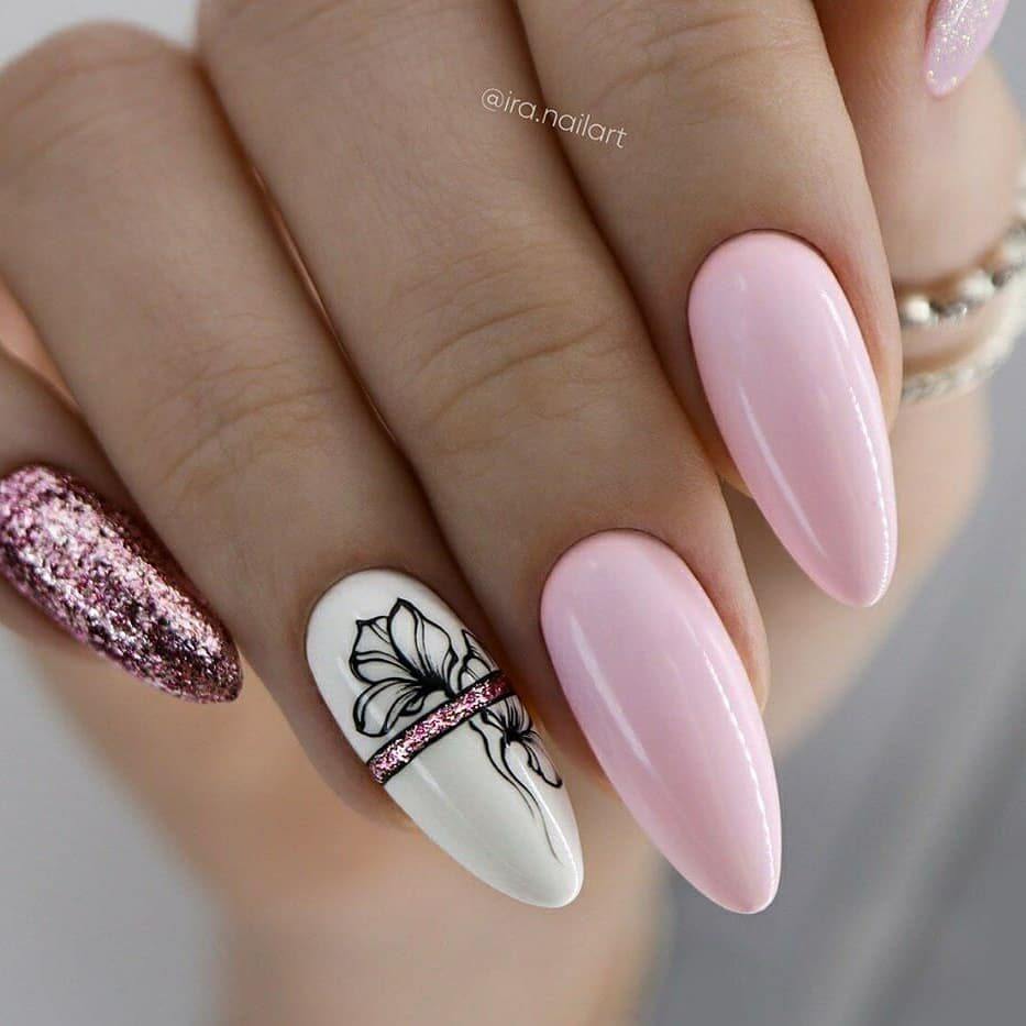 В тренде однотонный маникюр в лиловом, персиковом, бледно-розовом, пастельном розовом цветах. Привлекательно выглядит мраморный маникюр в розовом цвете с вкраплениями шиммера или глиттера. С розовым цветом можно выполнить множество контрастных нейл-артов. Присмотритесь к маникюру с темной флористикой, например, черными веточками и листочками на розовом фоне. Красиво выглядит дизайн, где узор покрыт меланжем или акриловой пудрой.