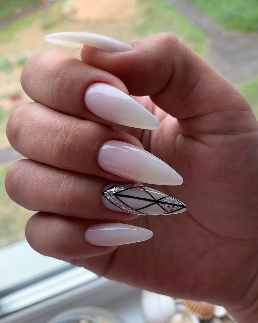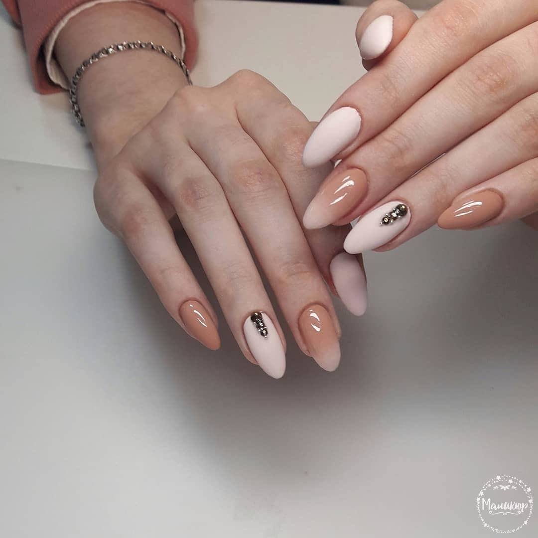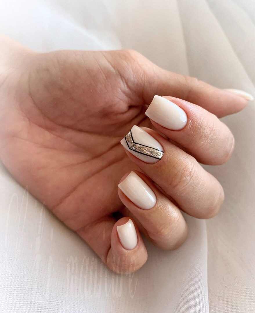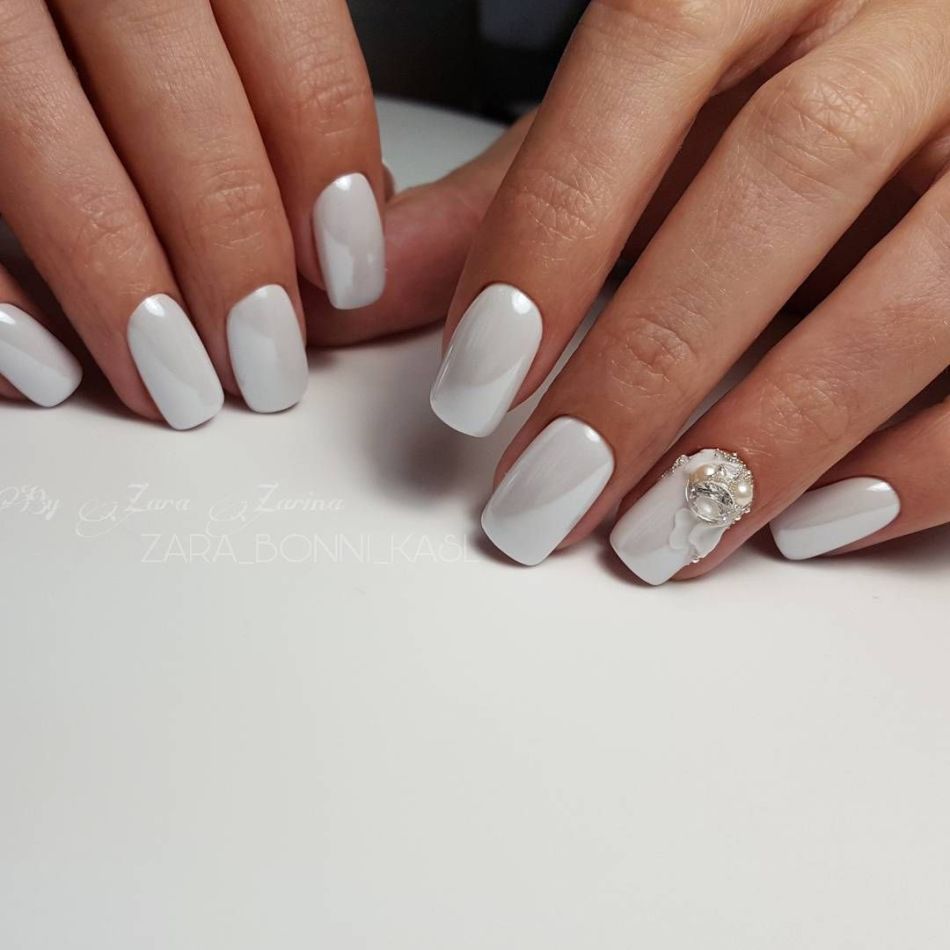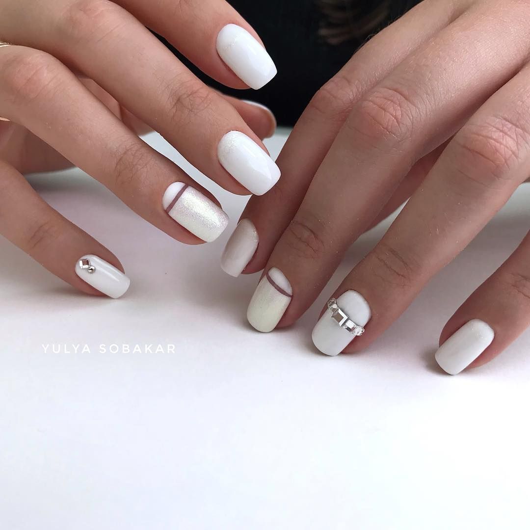 Если в дизайне молочный оттенок лака сочетается с другими цветами, то можно смело использовать в работе украшения в тон дополняющему оттенку и красиво обыграть подобное решение в стиле «разные ручки». Монохромные вариации чудесно смотрятся с классическими видами декора. Такой маникюр не оставит ваши ручки без внимания и станет чудесным завершением любого образа.
