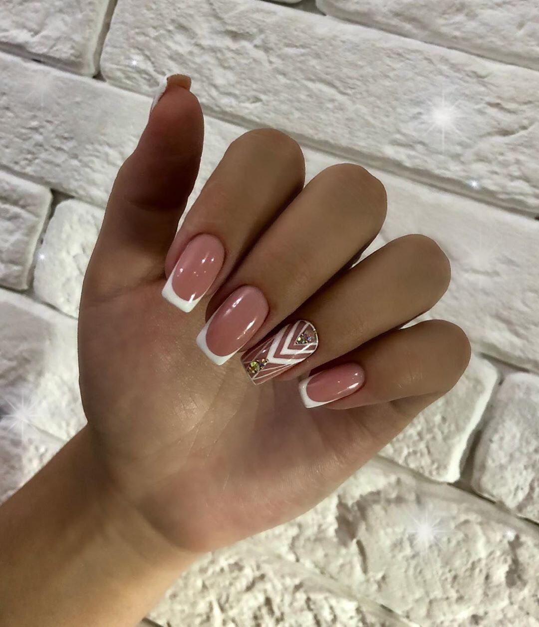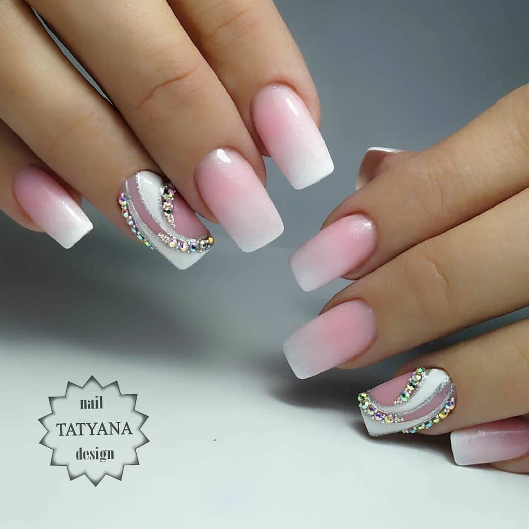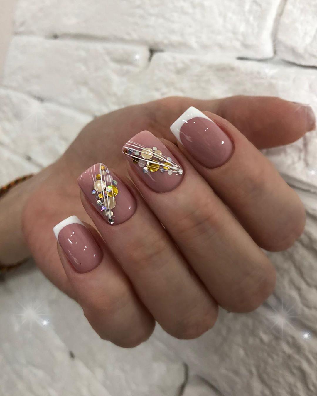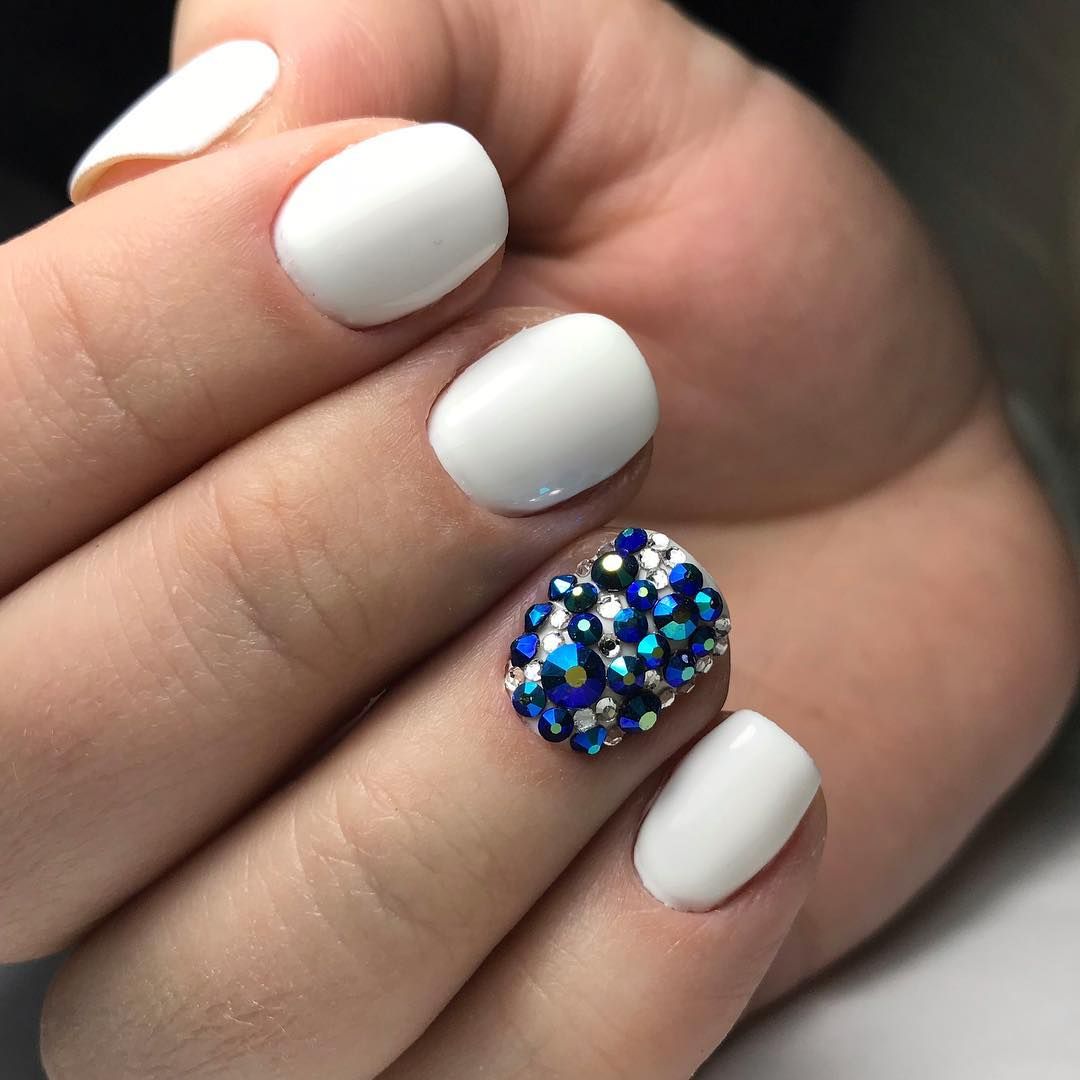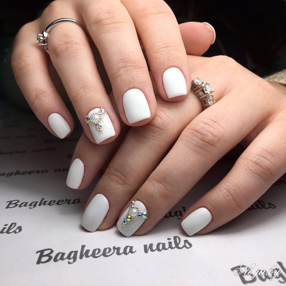 Барышням, которые считают, что наличие блёсток на ноготках с молочным оттенком выглядит недостаточно выразительно, мы предлагаем обратить внимание на эффектные идеи подобного маникюра с дополнением в виде страз, которые также как и предложенный выше декор имеет много разновидностей. Очень красиво смотрятся в этом случае однотонные ноготки с выделением акцентного безымянного пальца дуэтом страз и блёсток и чудесные рисунки или мраморные узоры с россыпью сверкающих частиц и акцентами в виде кристаллов