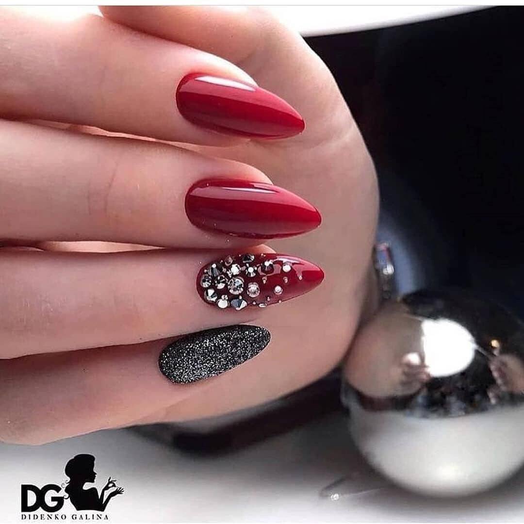 На коротких ногтях рекомендуется использовать темные оттенки красного цвета. Слишком детские розоватые тона лучше отложить на весенние нейл-арты с флористикой. На короткой ногтевой пластине желательно размещать однотонные нейл-арты с блестками, выделять 1-2 ноготка сплошным слоем глиттера.