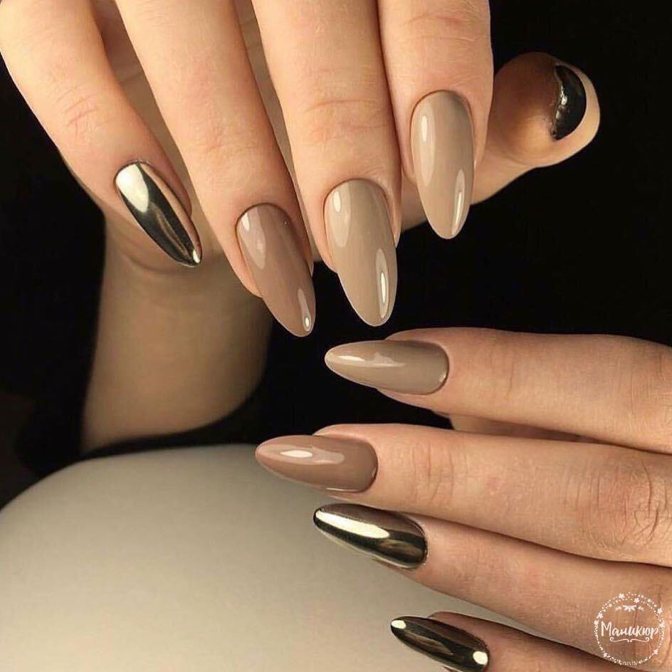 Блестящий маникюр отлично выглядит на коротких и длинных природных ногтях, а также на наращенных и накладных. Такое покрытие позволяет скрыть дефект ногтевой пластинки. Также с помощью блестящего дизайна можно визуально откорректировать ее форму.