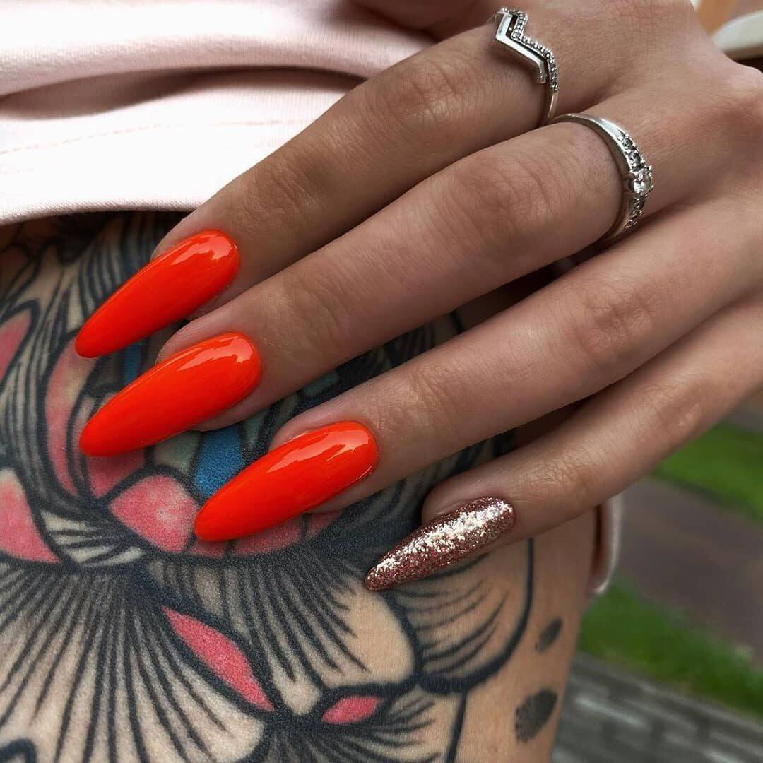 Исходя из этого, барышням позволено смело экспериментировать в процессе оформления ноготков. Среди актуальных примеров можно выделить яркий красный маникюр с мизинцем, полностью покрытым мелкими блёстками и узором из страз в прикорневой зоне безымянного пальца. Не менее шикарно смотрится расположение блёсток на среднем пальце и страз на безымянном в ярком синем дизайне. Такой же эффект имеют глиттерные рисунки с некрупными камнями на жёлтых ноготках и многие другие идеи, способные максимально подчеркнуть индивидуальность и настроение модницы.