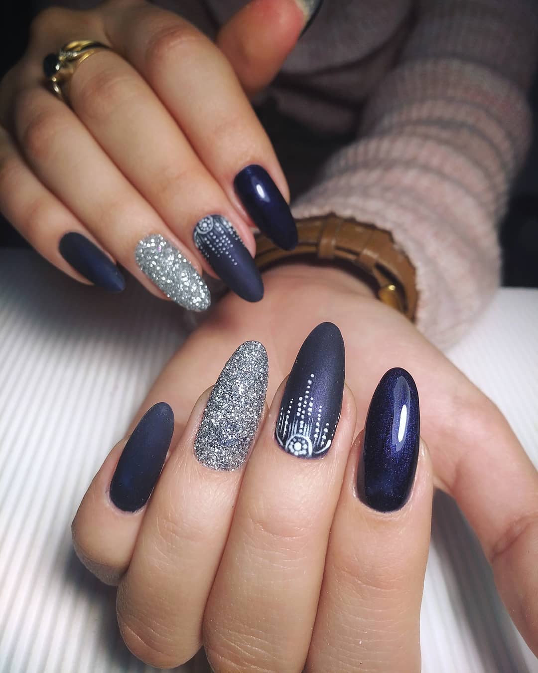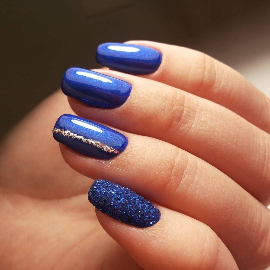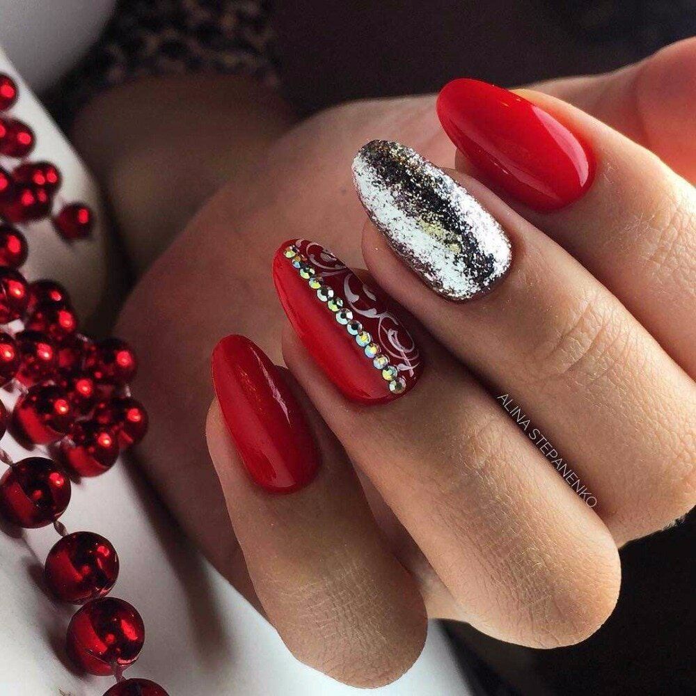 Полоса с блестками на однотонном ногте, рядом с ногтем покрытым блестящим гелем, придает этому маникюру завершенность.