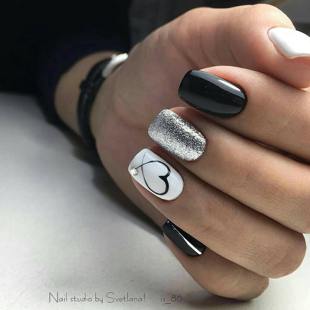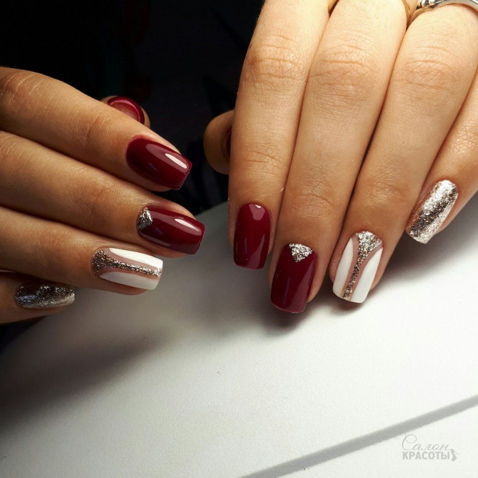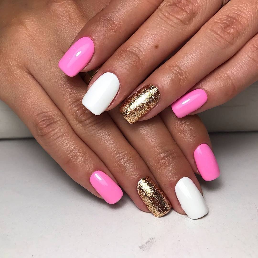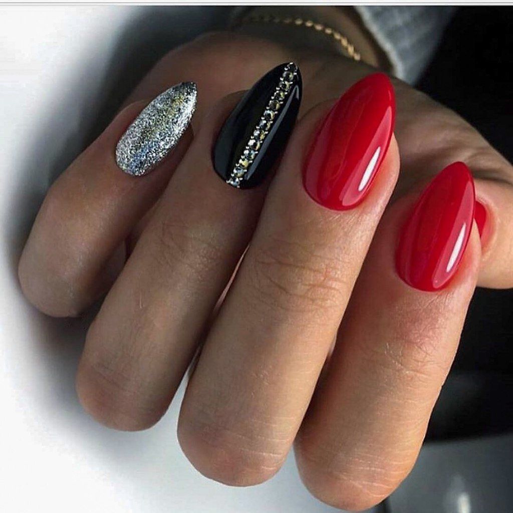 Другим стильным вариантом оформления маникюра может стать сочетания нескольких цветов с использованием блесток. Удачным вариантом считается плавный переход одного цвета, но в разных оттенках по всем пальцам руки. Либо используют 2-3 контрастных цвета. Например: черный и белый, красный, белый и золотой.