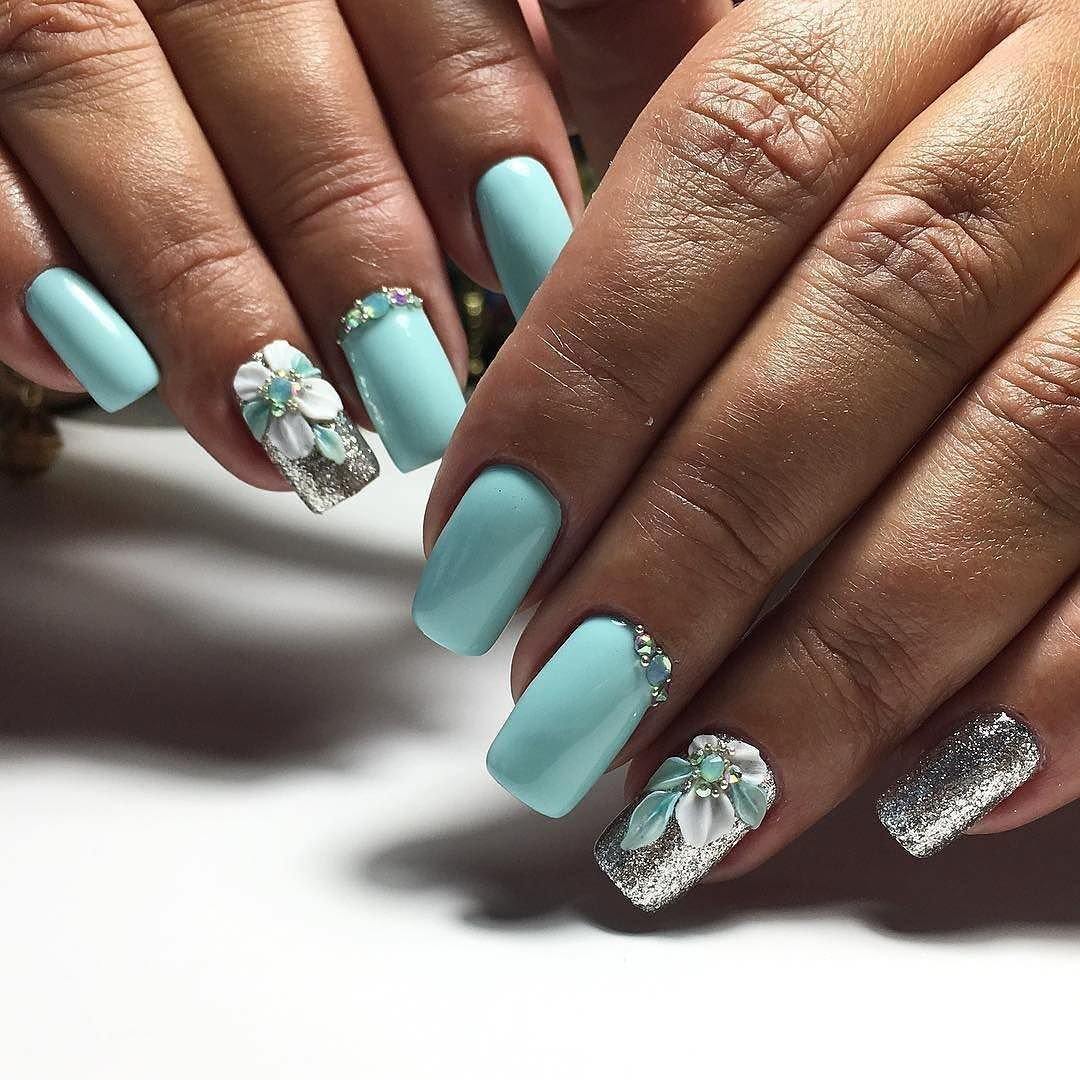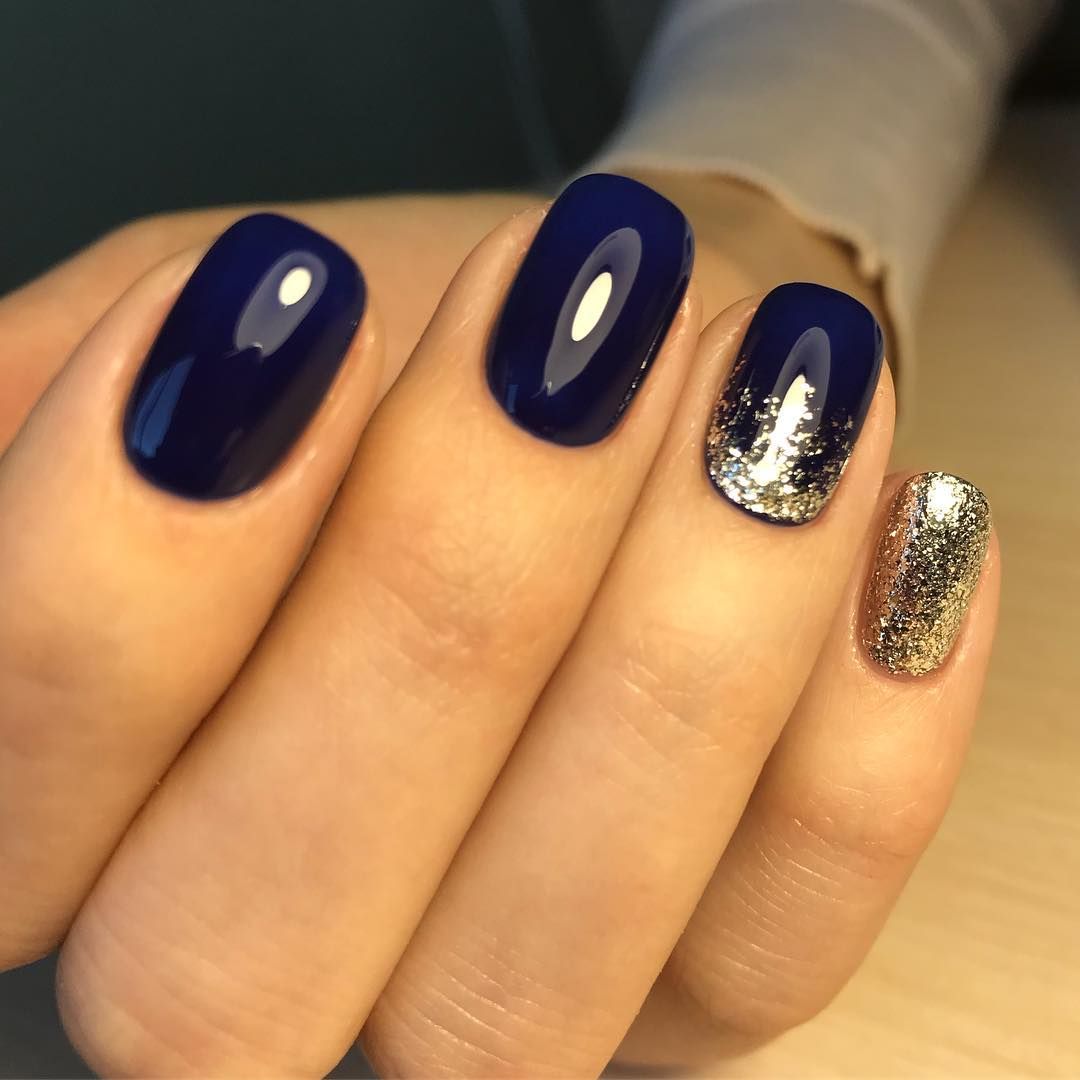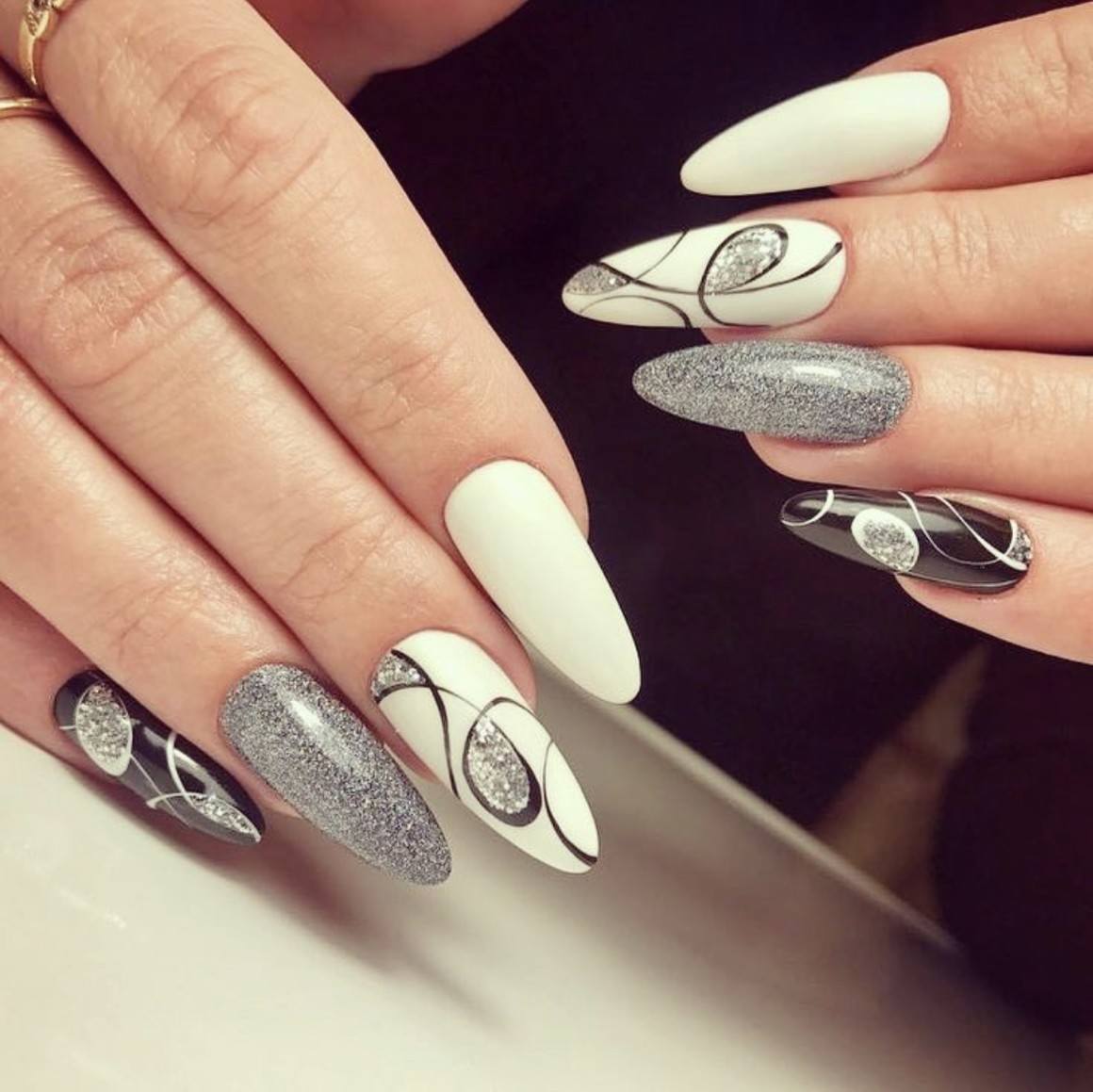 Другим стильным вариантом оформления маникюра может стать сочетания нескольких цветов с использованием блесток. Удачным вариантом считается плавный переход одного цвета, но в разных оттенках по всем пальцам руки. Либо используют 2-3 контрастных цвета. Например: черный и белый, красный, белый и золотой.