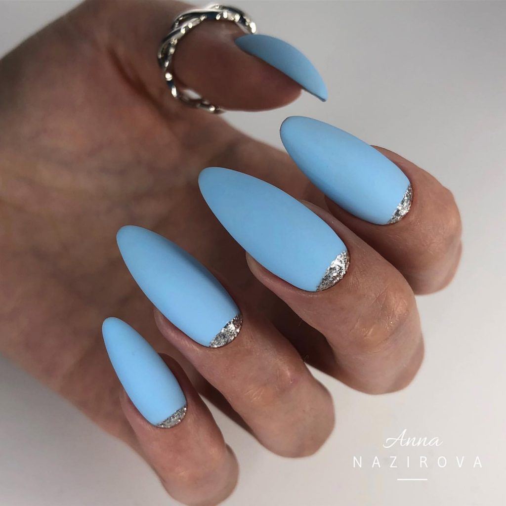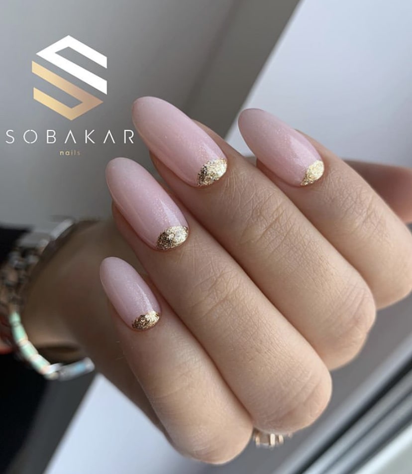 Невероятно красивые ногти получатся, если с помощью глиттерной пудры оформить линию «улыбки». С блестками на кончиках маникюр впишется как в нарядный, так и повседневный образы.