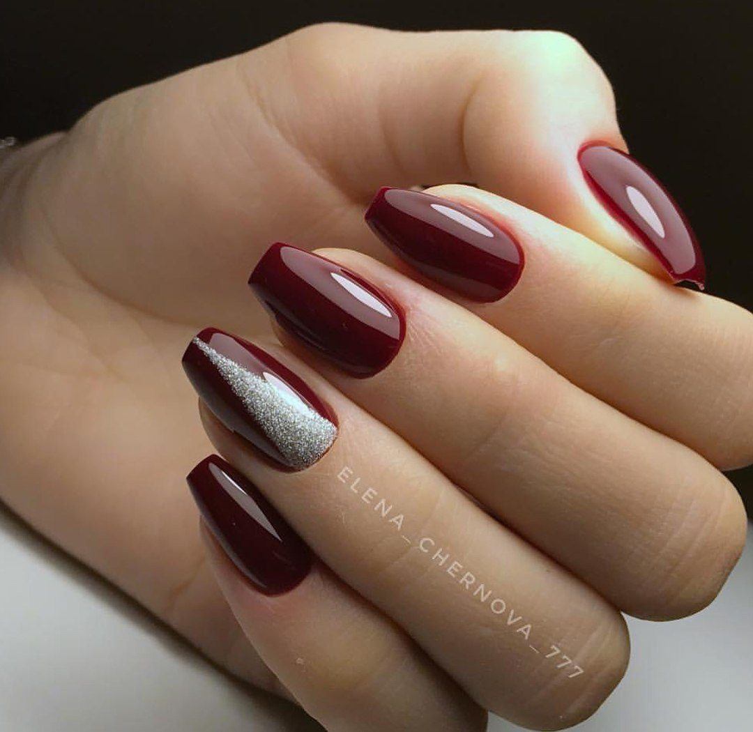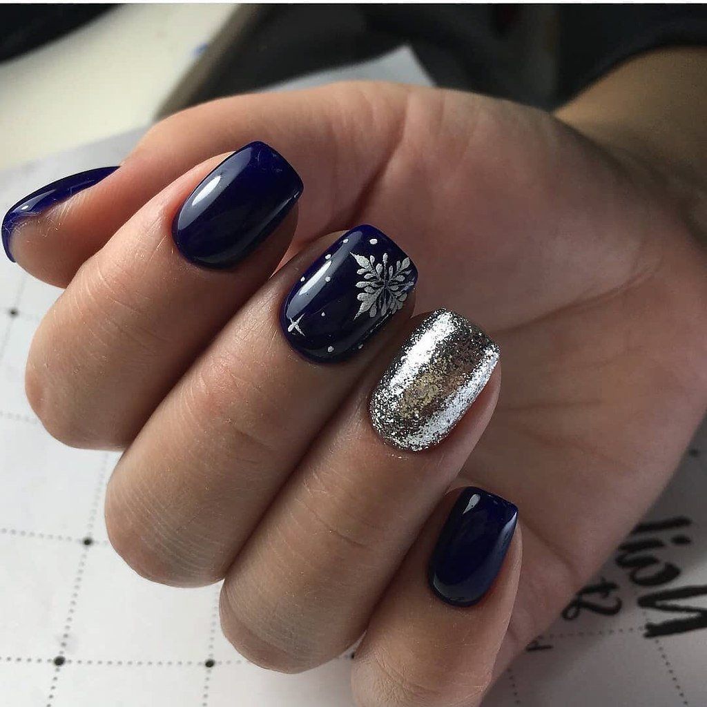 Блестящие гель лаки отлично выглядят в простых геометрических формах. Нарисовать такой треугольник не составит особого труда. Делать это нужно тонкой кистью. Не забудьте ее потом как следует промыть, составы с блестками смываются хуже чем простые однотонные лаки или краски.