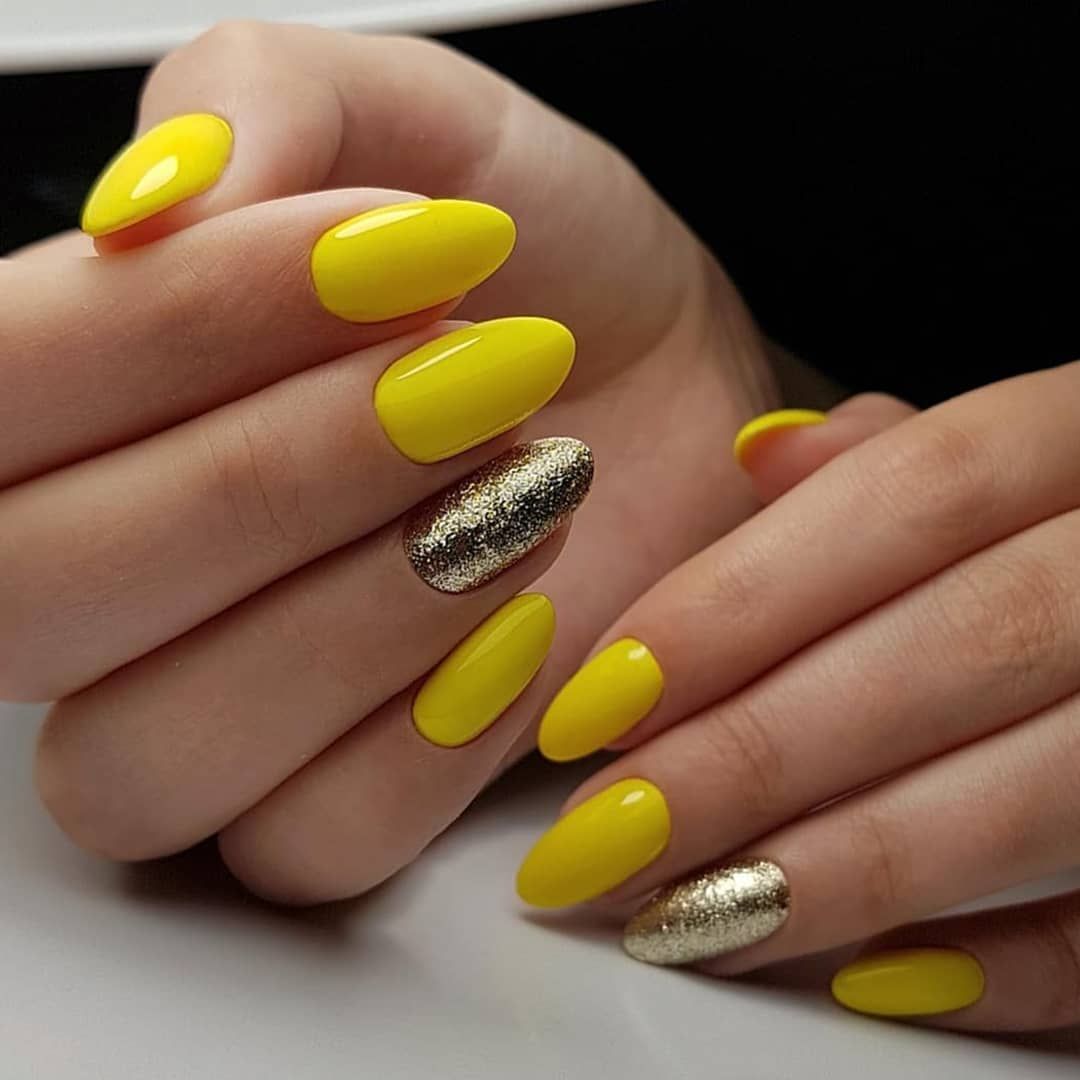 #5 Ярко-желтый маникюр с блестками