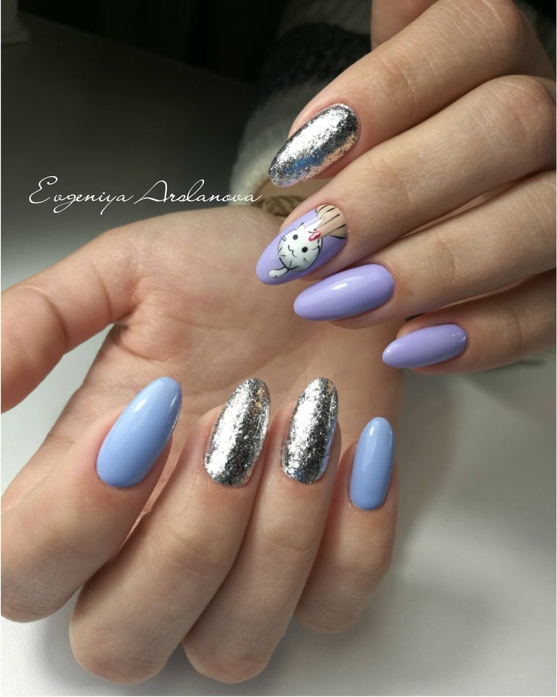 Интересный вариант с растяжкой. На большом пальце градиент, на безымянном наклейка с надписью в рамке из блесток.