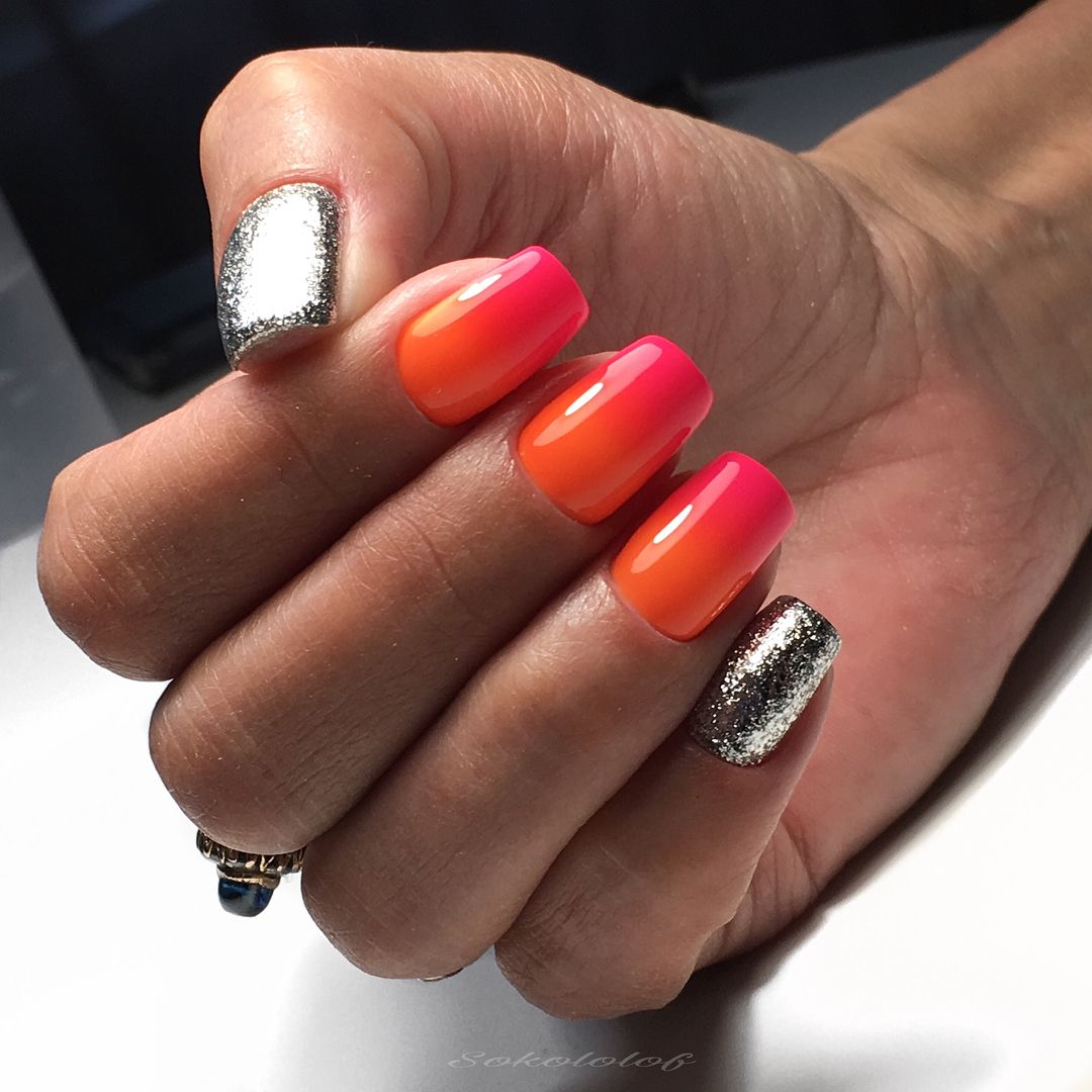 Последний вариант с градиентом – растяжка цвета сверху на блестящий гель. Смотрится весьма необычно.