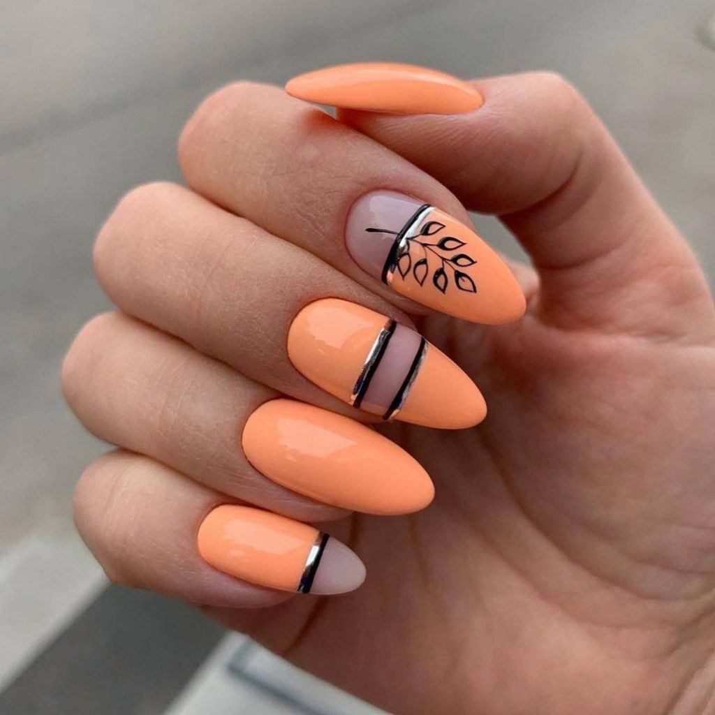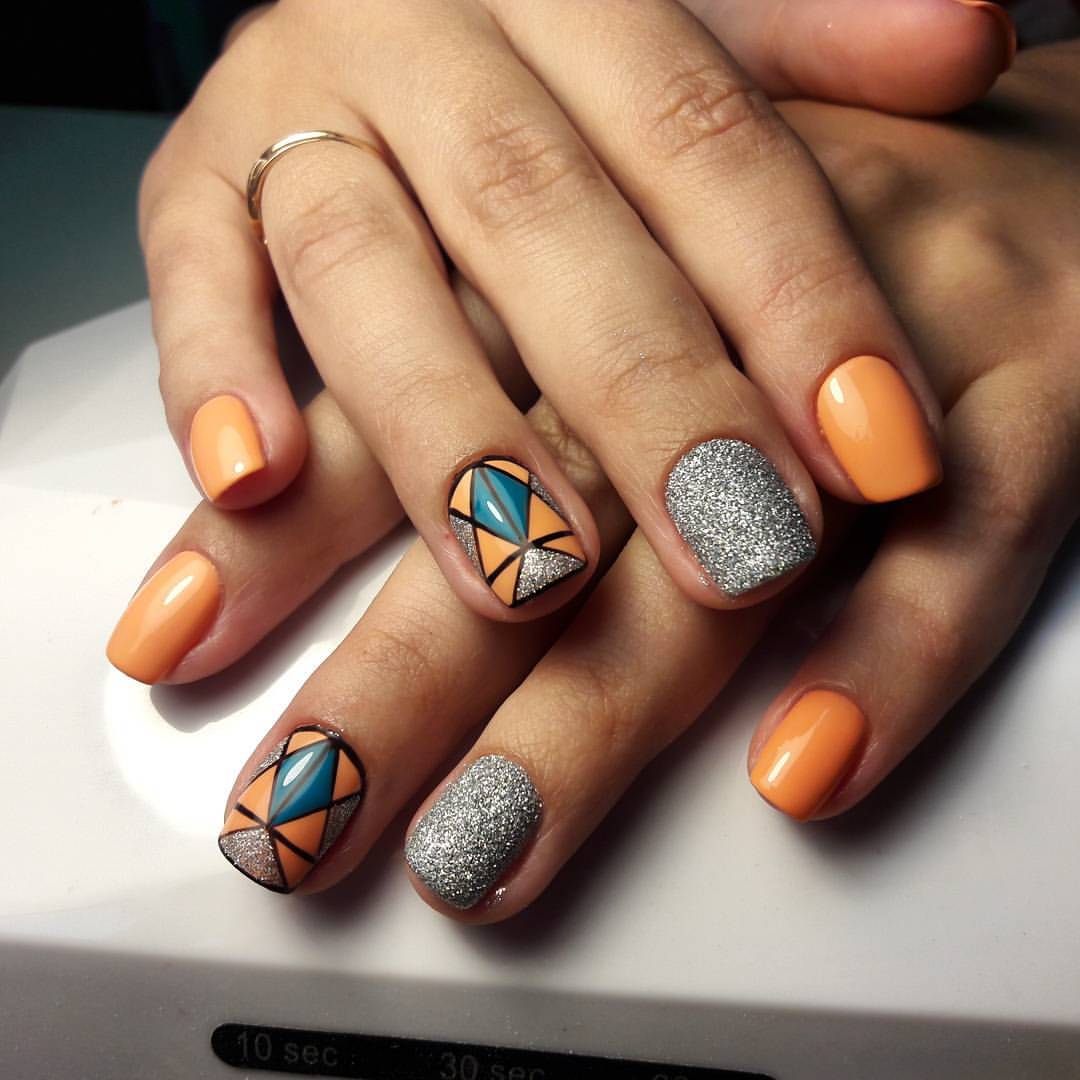 Оттенки оранжевого, темно-зеленого, чистый белый подходят, чтобы разбавить рисунки на ногтях лаком по мотивам традиционного коврового ткачества.