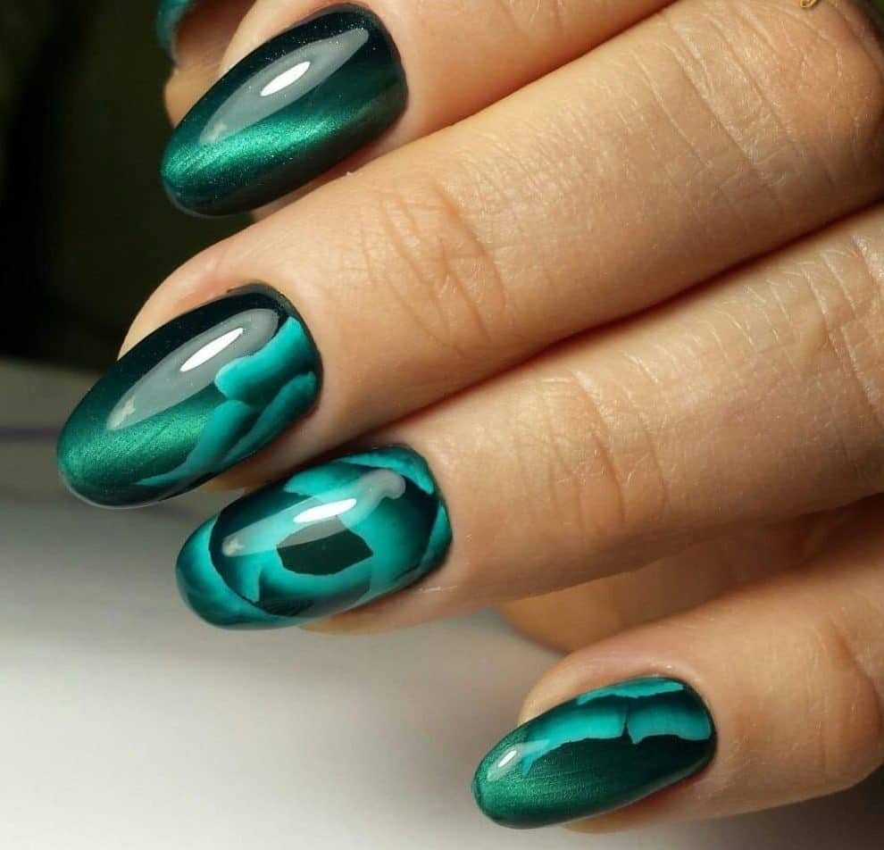 - Осталось раскрасить ногти “мрамором”. Для этого используйте кисточку и контрастный цвет гель-лака.