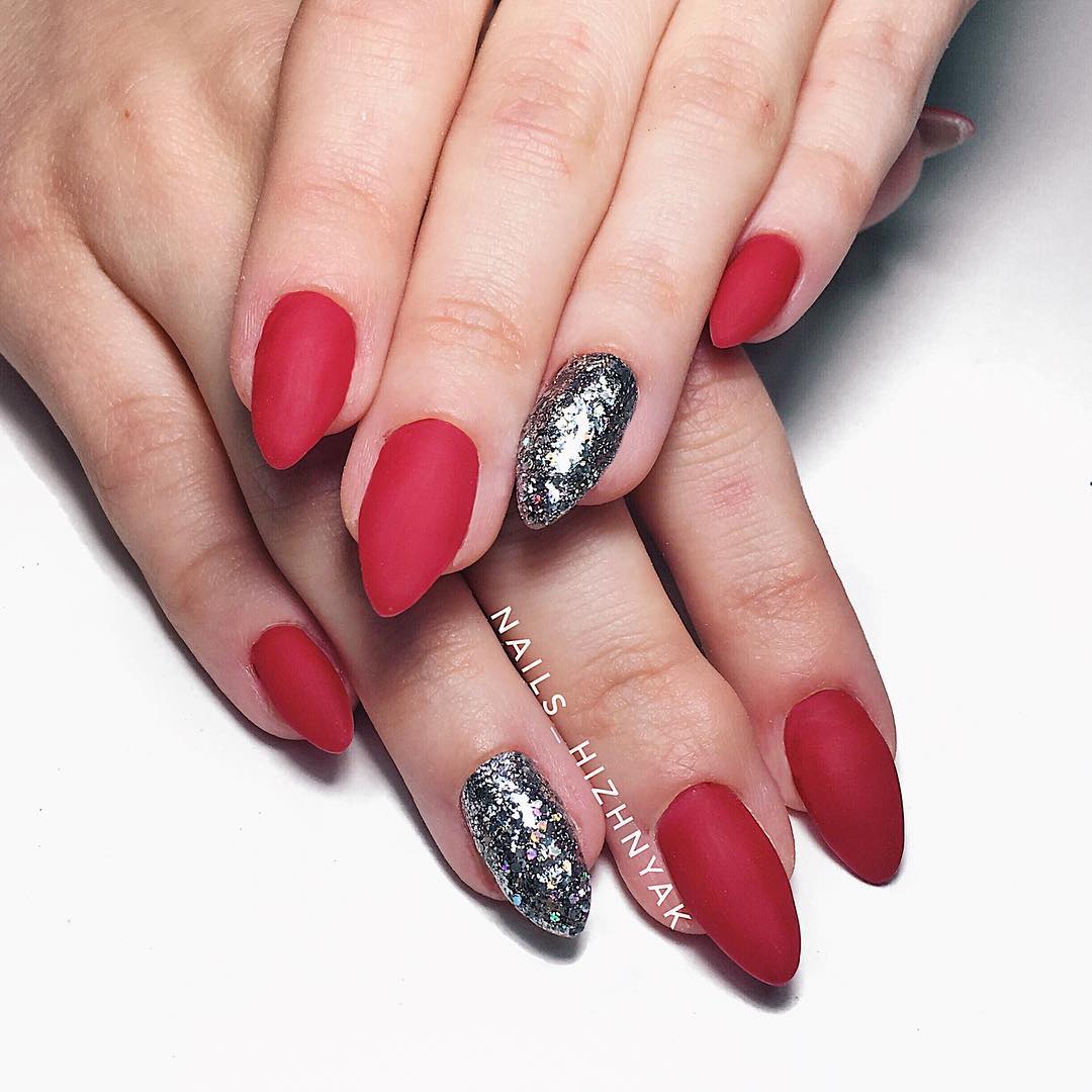 Красный маникюр, покрытый серебряным блеском отлично подходит в качестве праздничного варианта. Не менее привлекательно выглядит имитация френча с помощью серебристого блеска.