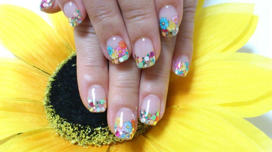 Нежный френч из блесток и белых цветов. Отличный вариант для образа невесты.
