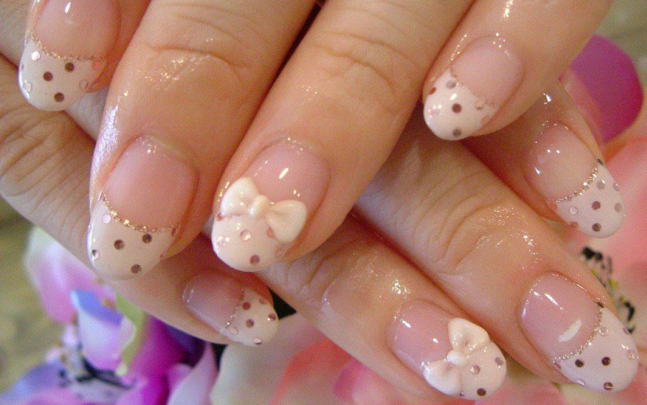 Стразы размером с горошин белого цвета отлично вписываются в этот дизайн. Такой френч подходит на каждый день.