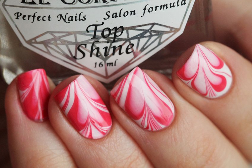 Вот какие чудеса могут творить вода и лак, маникюр получается просто восхитительным. Не расстраивайтесь, если с первого раза дизайн получился не таким очаровательным, как на фото. Несколько тренировок, и он обязательно поддастся вам!