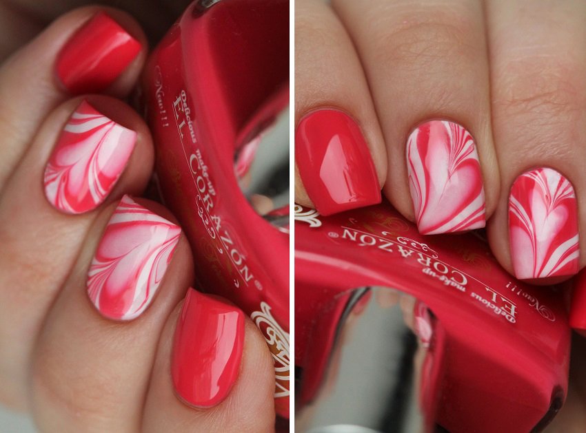 Обратите внимание, что на фото ниже водный маникюр сделан всего из двух контрастных цветов лака для ногтей: ярко-красного и белого. Если Вы только начинаете экспериментировать с многоцветным маникюром и озадачены подбором цветов, то попробуйте подобную комбинацию из двух лаков, один из которых белый