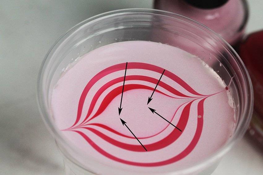 - Если в воде капельки лака не растекаются, из-за чего не получается рисунок, то лак недостаточно жидкий. В том случае, если на воде лак почти сразу покрывается корочкой, нужно поменять воду на более теплую. Иначе не получится провести зубочисткой линии.