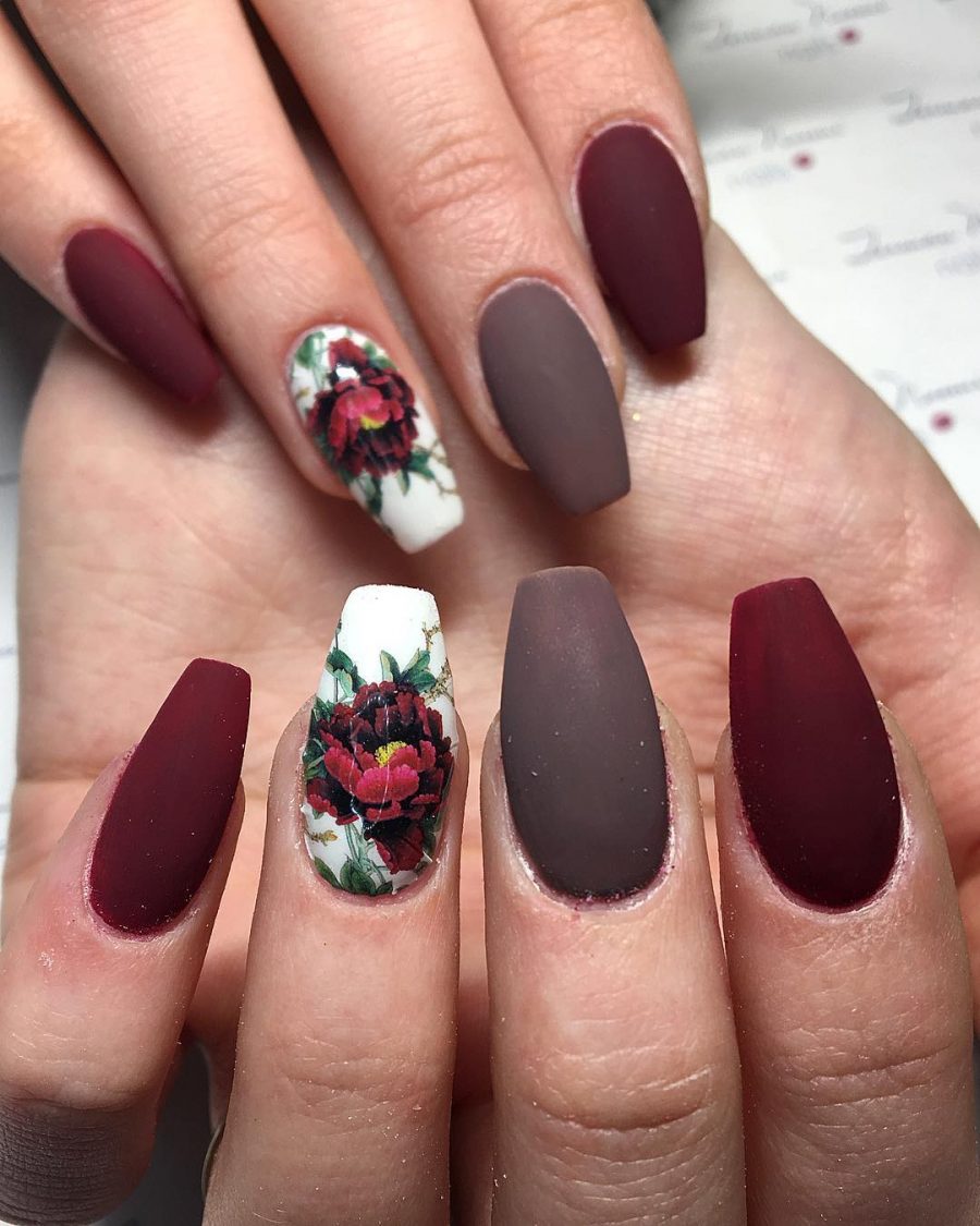 Маникюр вишневого цвета с негативным пространством, плавным переходом и цветочными слайдерами на фото выглядит великолепно!