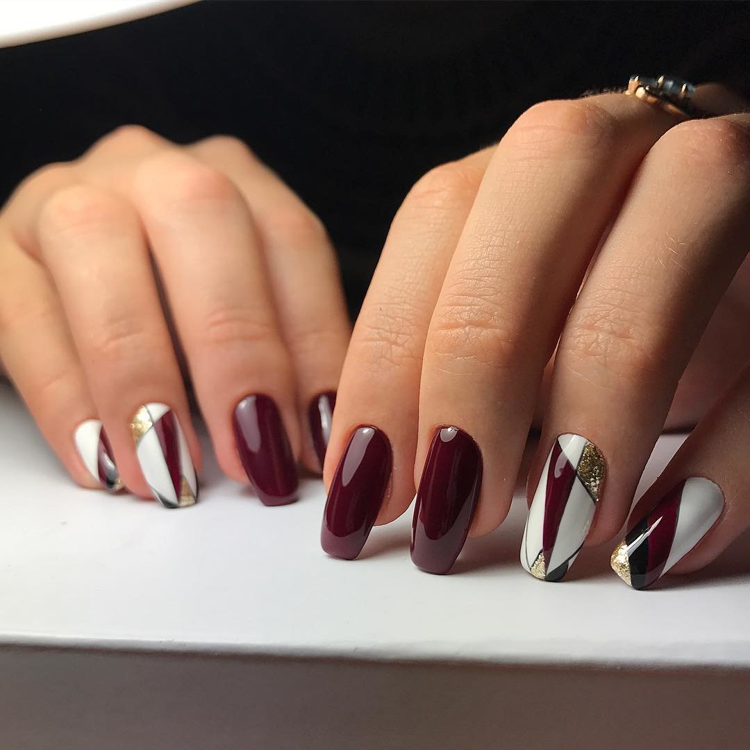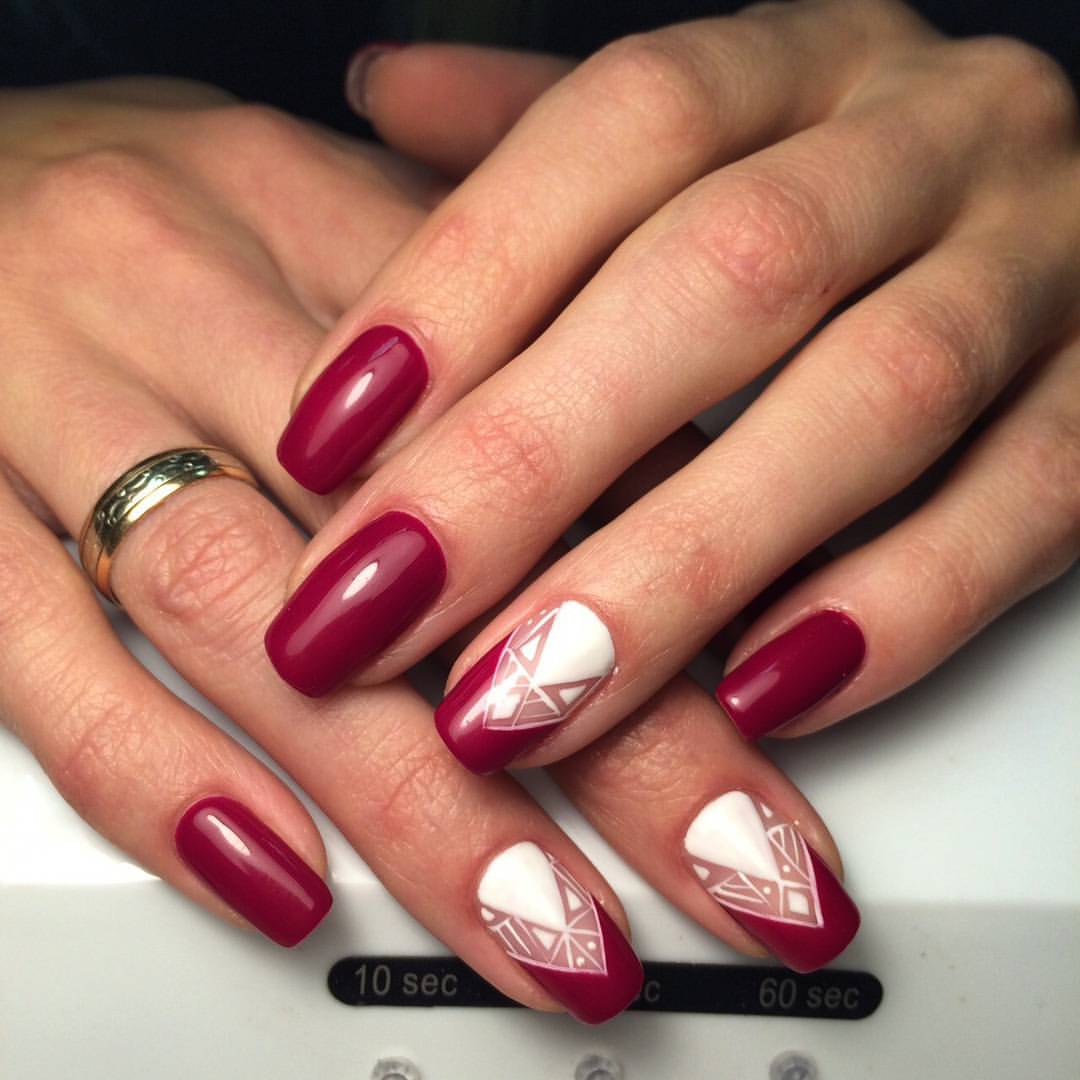 В качестве дополнения геометрического маникюра используйте различные оттенки вишневого, сиреневый, серый, белый цвет. Они помогут создать объемный дизайн ногтей и разделить пространство ногтевой пластины на идеально ровные геометрические фигуры.
