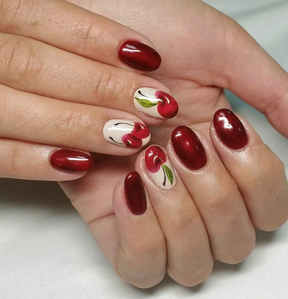 Мы уже показывали среди многочисленных вариантов дизайна с клубникой маникюр «клубника со сливками». С вишней такое оформление ногтей тоже возможно. Нарисуйте крупные ягоды на двух-трех ногтях и добавьте белый лак, как будто на вишню попало несколько капель сливок.