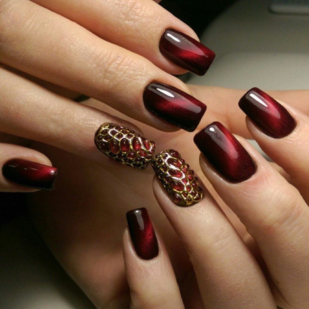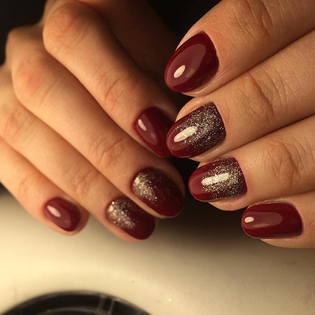 Ещё одной беспроигрышной цветовой комбинацией вишнёвого маникюра является вишня с золотом. Превосходно смотрится золотистая лунка ногтя или свободный край в стиле френч.
