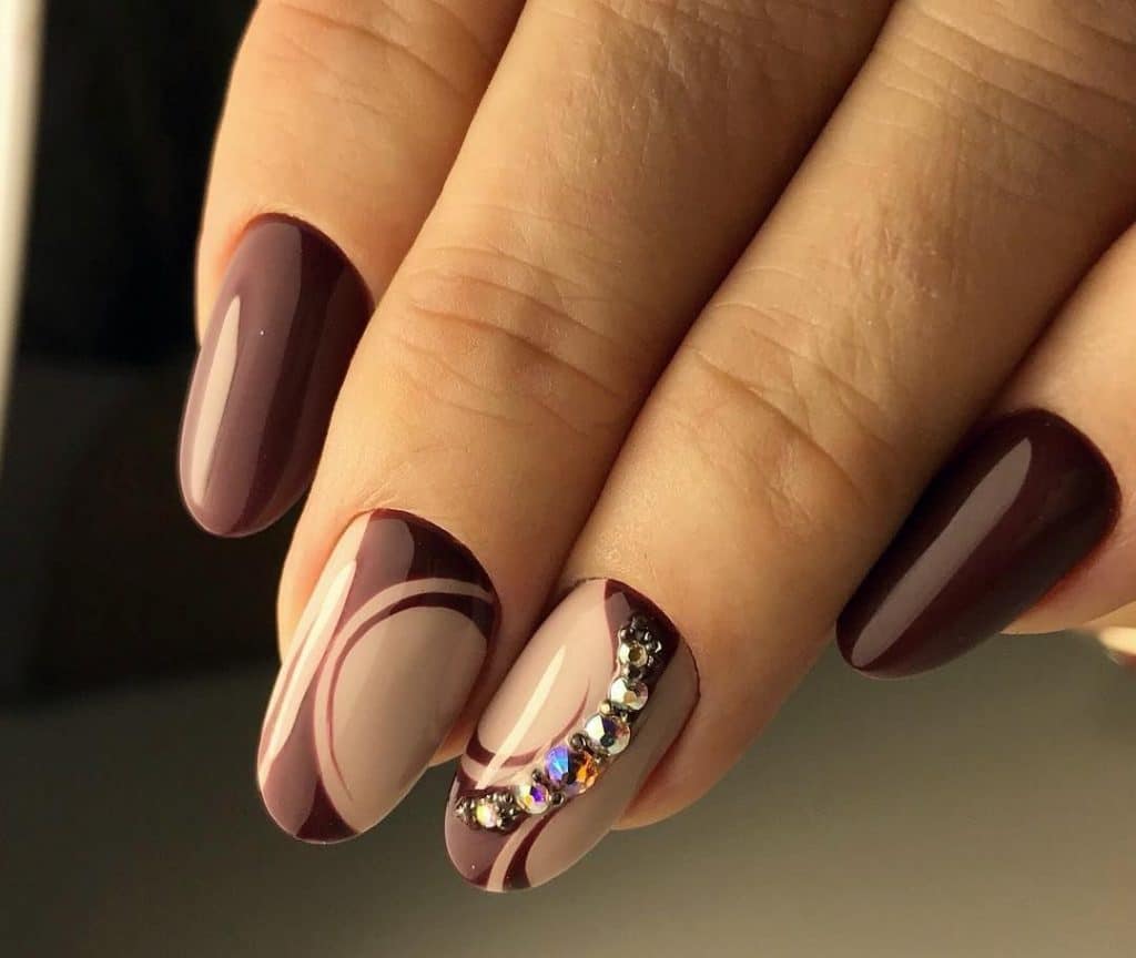 На ногти наносят базу, просушивают в лампе и покрывают бежевым лаком в 2 слоя, каждый сушат отдельно. Берут кисточку и прорисовывают тонкие витиеватые линии коричневым цветом. Если чистого оттенка нет, его получают, соединяя синий и зеленый лаки.