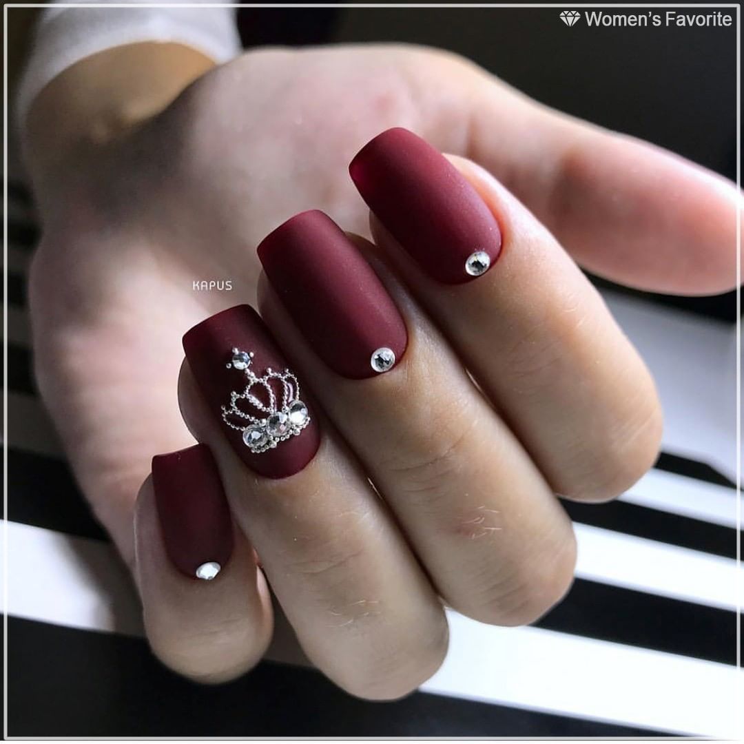Однако при желании разнообразить матовую текстуру, можно выделить один пальчик золотым узором или сверкающим кристаллом.