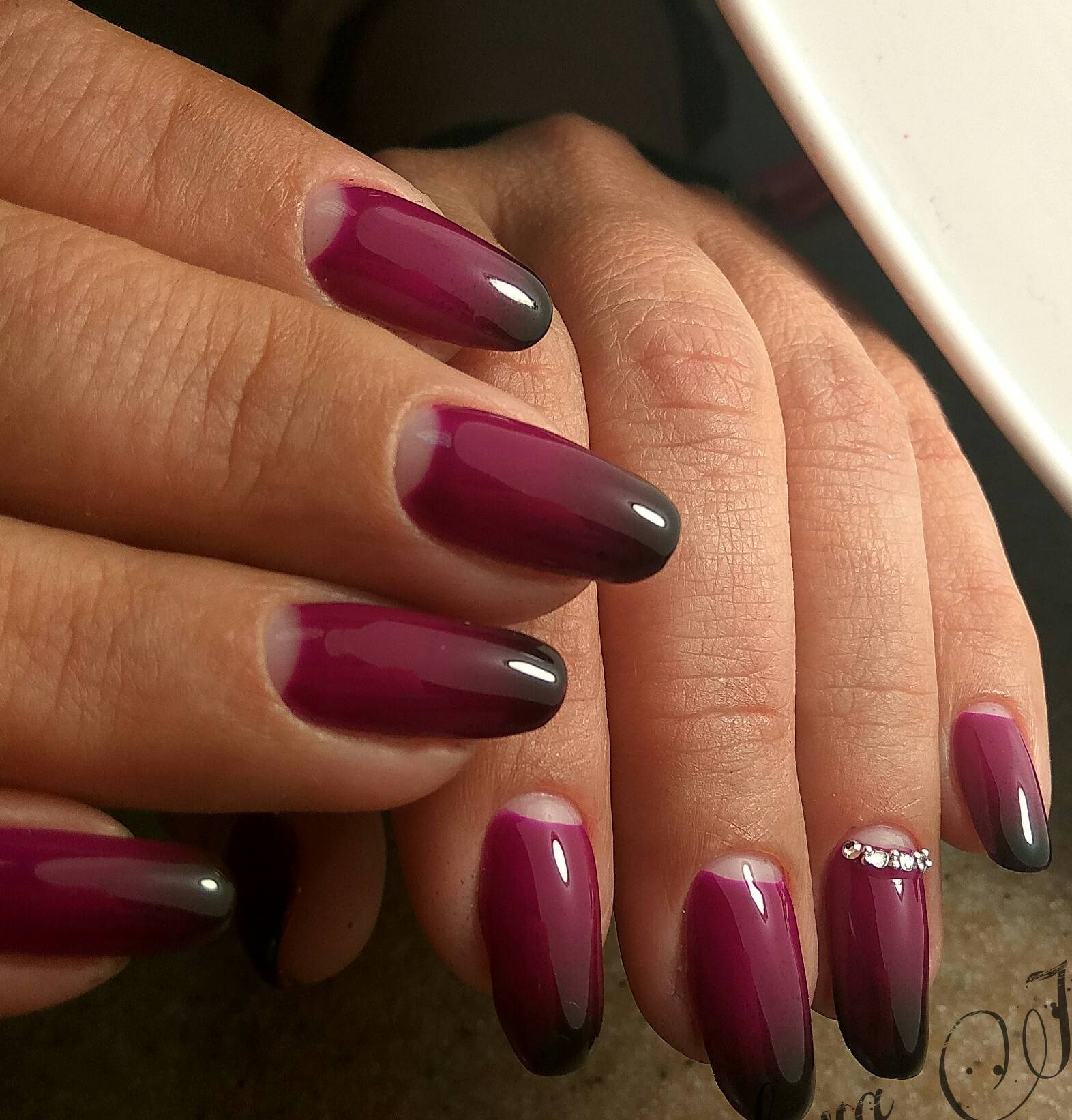 - Для градиента стоит выбрать 1-2 ногтя. В качестве подложки рекомендуется покрыть вишневым или белым оттенком.