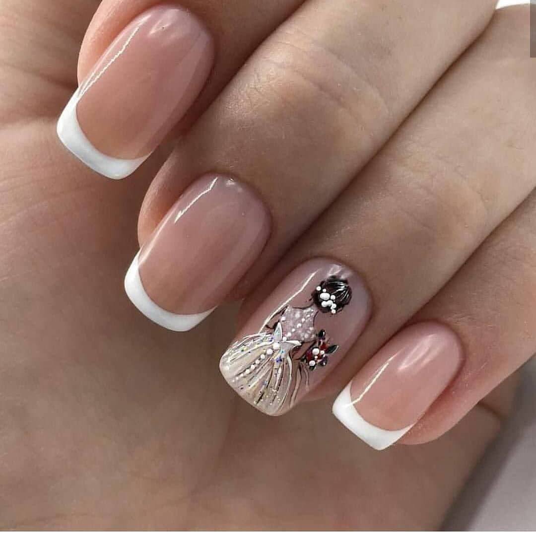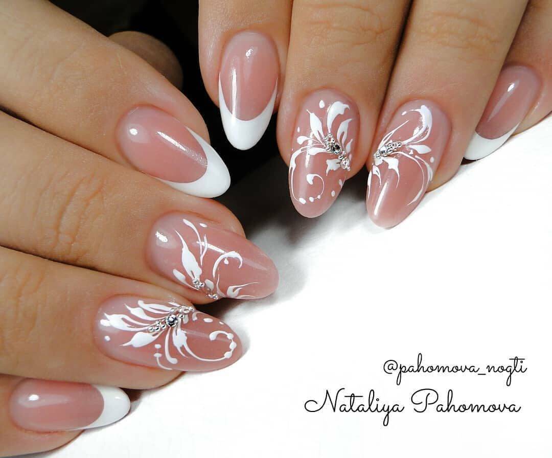 Популярность страз в нейл-дизайне можно сравнить только с рисунками, поэтому сочетание во французском маникюре этих дополнений можно назвать очень актуальным решением. Разнообразные рисунки идеально впишутся как в классический, так и в любой другой вид дизайна. Изображения могут располагаться на одном-двух ноготках или наноситься все пальчики. Среди популярных эскизов можно выделить флористику, геометрические формы, кружевные узоры, часто выполняющие роль «смайлика», а также абстрактные композиции, сезонные изображения и тематические рисунки, которыми украшают ноготки для определённых праздников или торжественных событий. Что касается декора, то благодаря разновидности страз можно освежить и преобразить любые зарисовки. Для вечернего образа приемлемы сложные композиции с крупными камнями, которые располагаются непосредственно на рисунке. При создании повседневного маникюра будет достаточно нескольких элементов. Всё зависит от вашего предпочтения и желаемого результат.