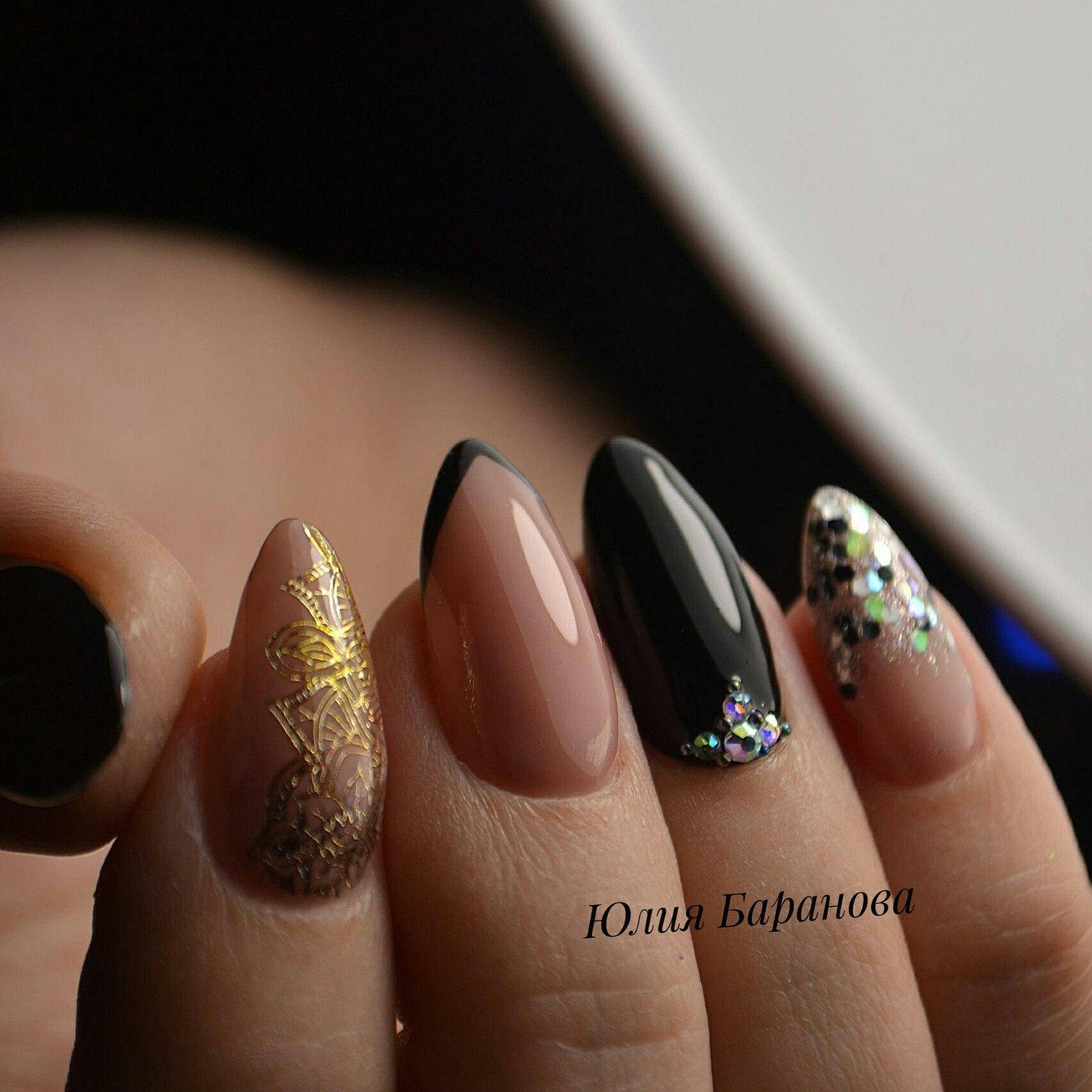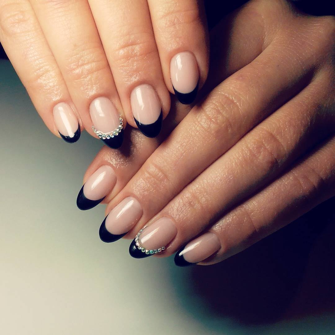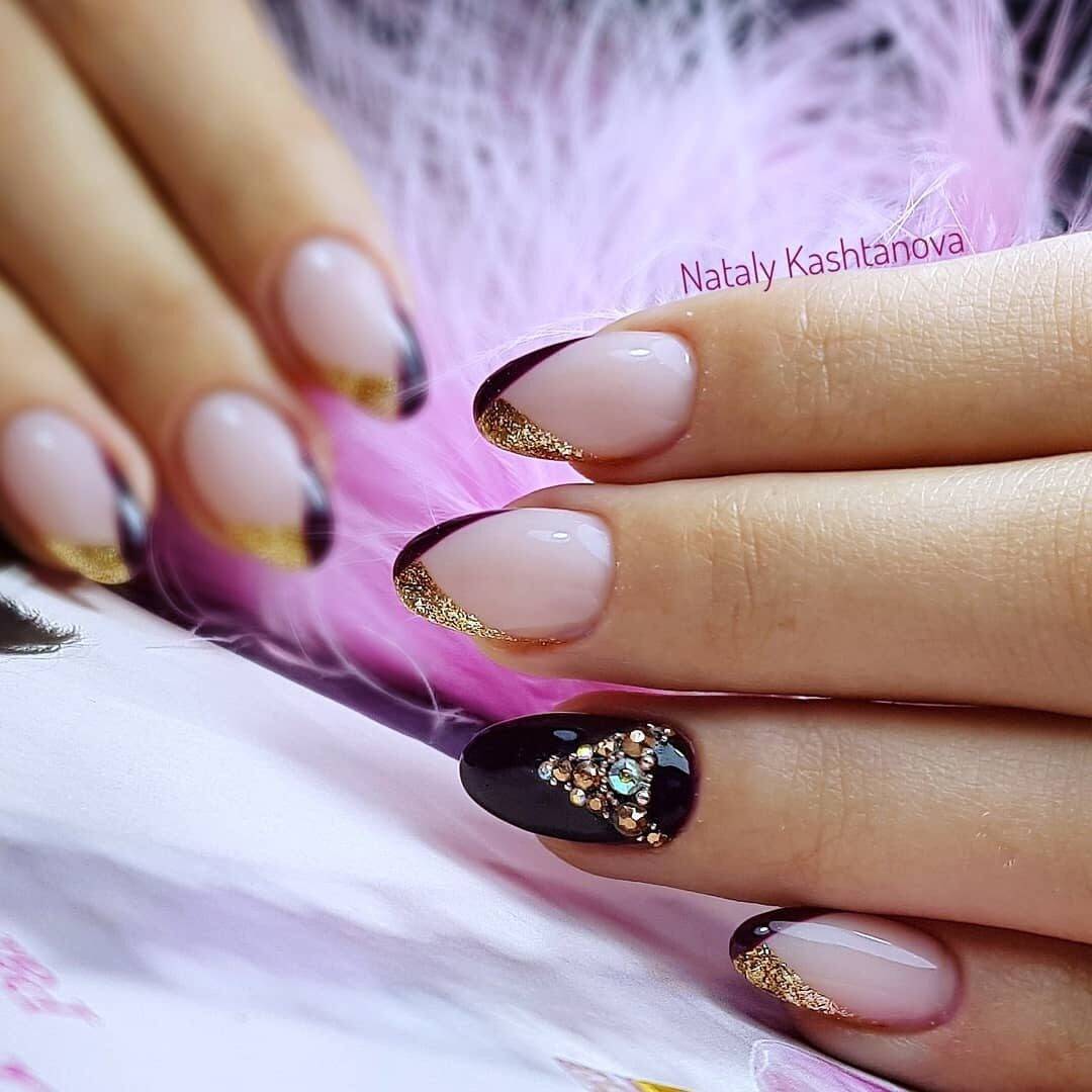Шеврона, то есть френч с заостренным контуром, хорошо смотрится с черным окончанием, мелкими завитушками золотым лаком и камушками в серединке.