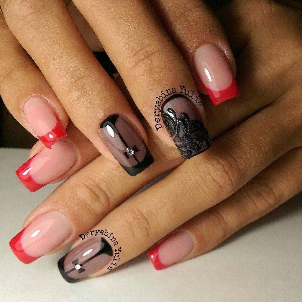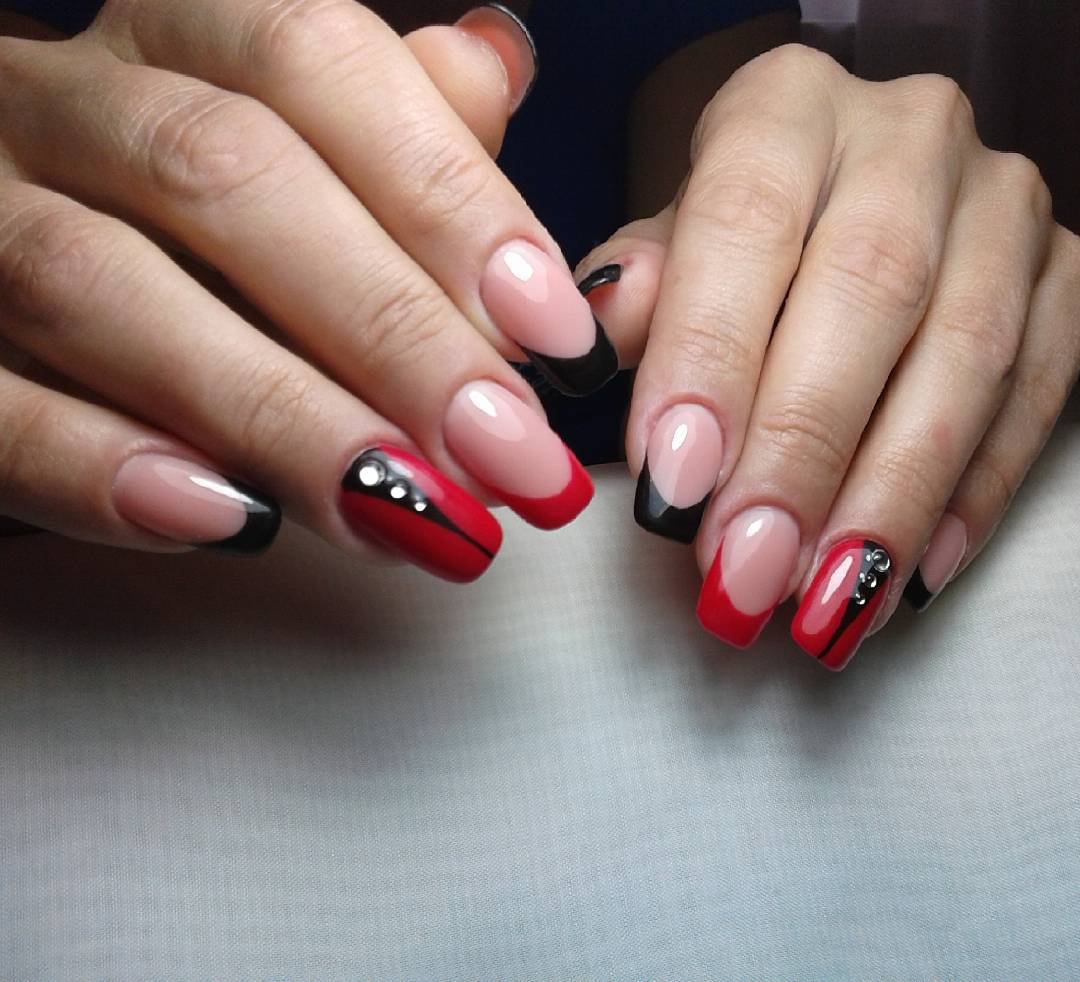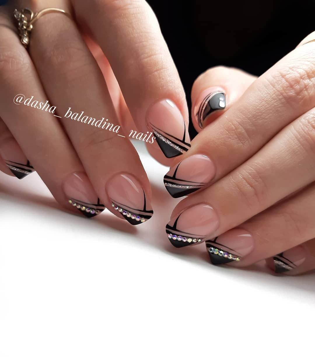 Шеврона, то есть френч с заостренным контуром, хорошо смотрится с черным окончанием, мелкими завитушками золотым лаком и камушками в серединке.