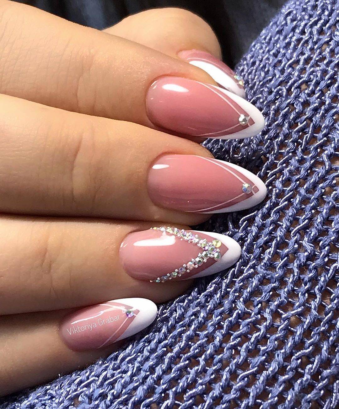 Перекрученные линии и расклейка камнями по диагонали – новая тенденция в нейл-арте. Но, в отличие от предыдущей подборки, стразы можно крепить не только по краям. Особо смелые модницы сочетают такой дизайн с росписью и объёмным декором.