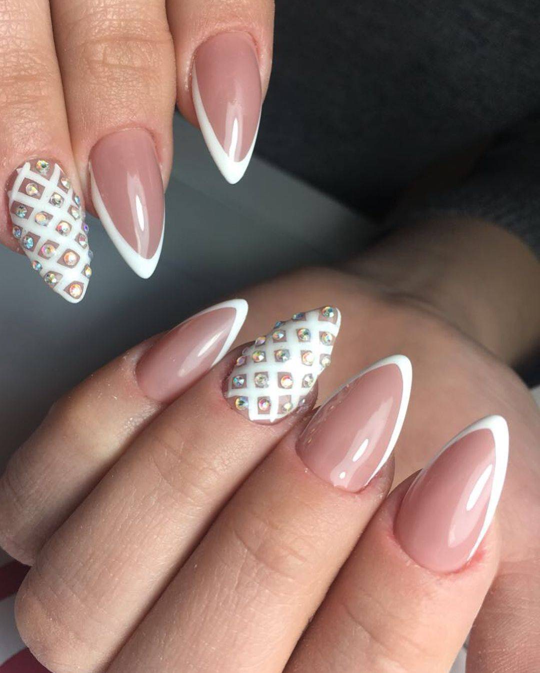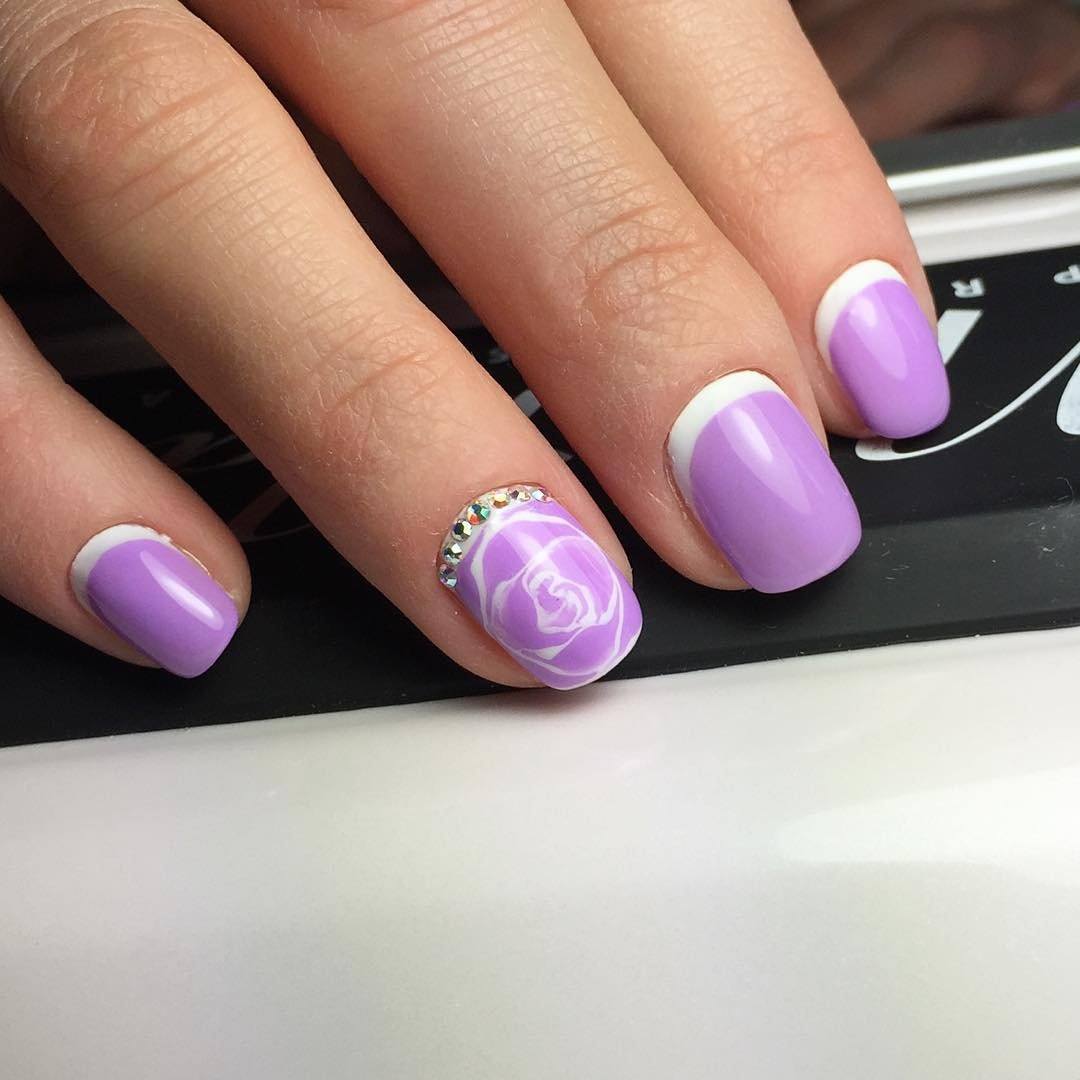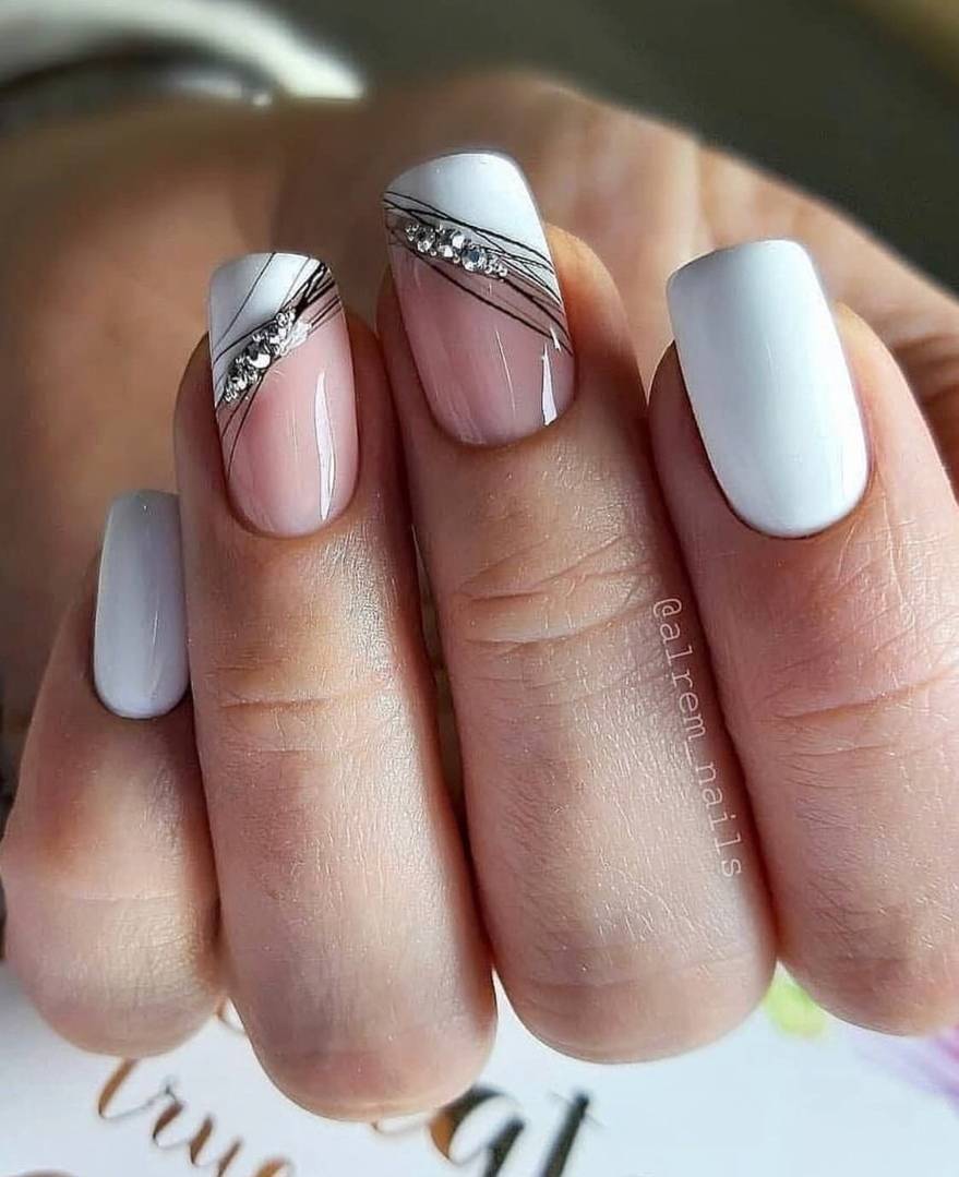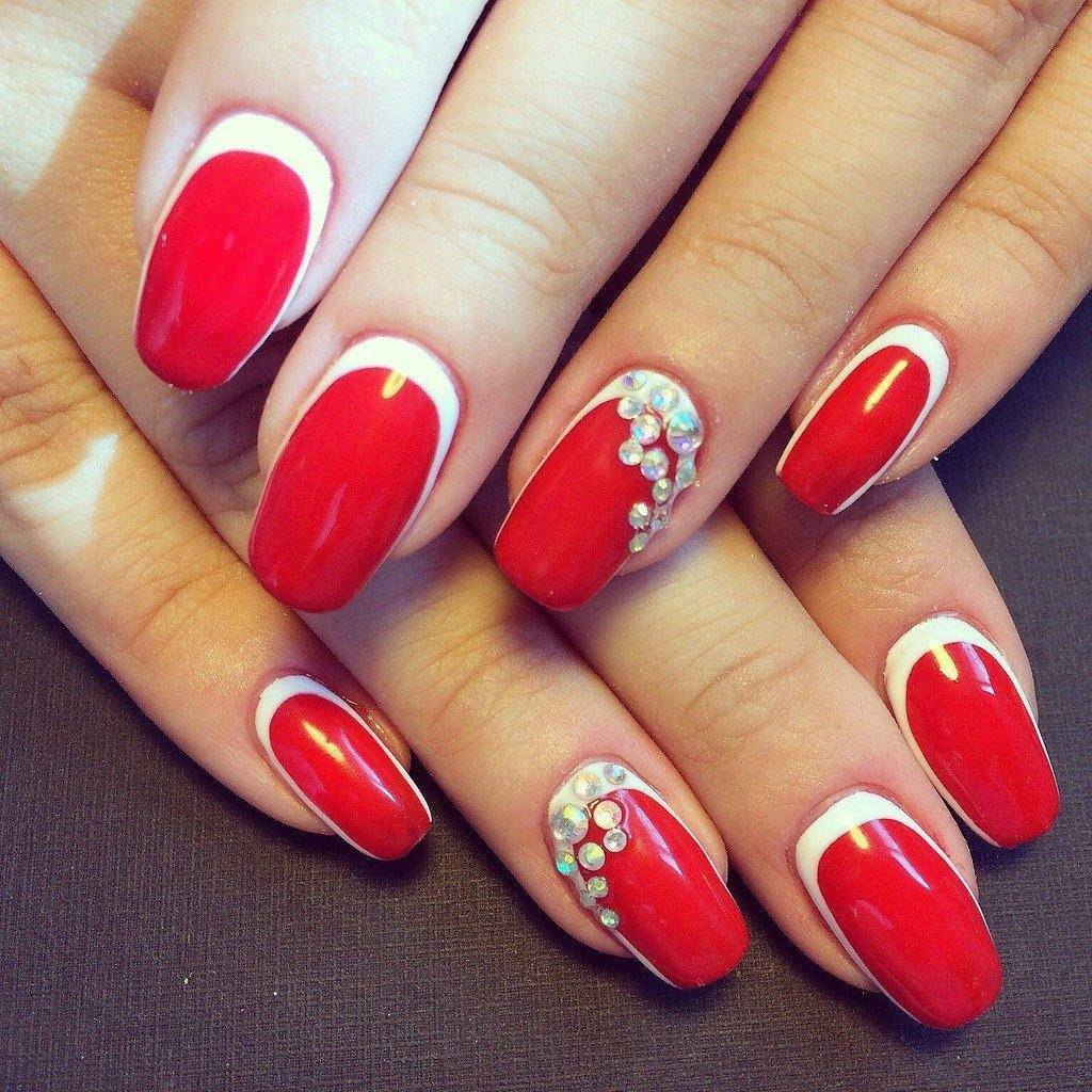 Белый прочно занимает лидирующие позиции, поэтому у каждой модницы лак такого тона всегда присутствует в косметичке. Он не менее универсален, чем черный, а если говорить о маникюре — то даже гораздо предпочтительнее. Классический белый френч, лунный маникюр или простое белое покрытие — все варианты являются достаточно яркими и ослепительными. Какие стразы подобрать для дизайна такого маникюра? Ответ — любые, главное фантазия.