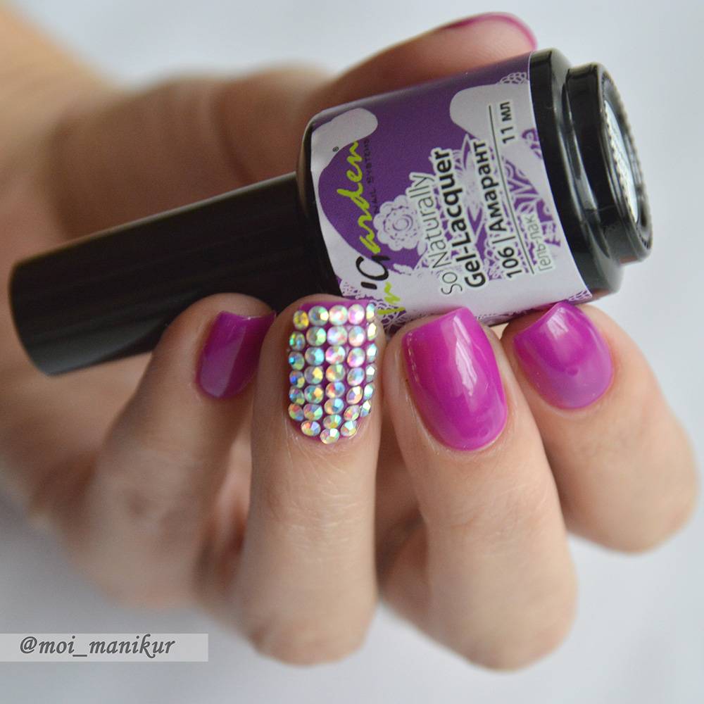 - Гель-лак под стразы также подойдет не всякий: не стоит использовать для этого перламутровые цвета, цвета с блестками и тому подобные – это будет перебором. При этом количество цветов гель-лака не должно превышать двух.