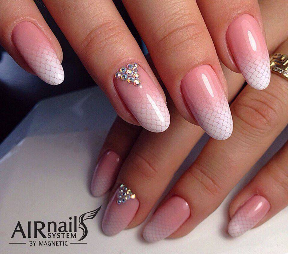 Для классического стиля, когда конец ногтя белый, подойдет размещение «улыбкой» по противоположному краю прозрачных или многокрасочных камешков.