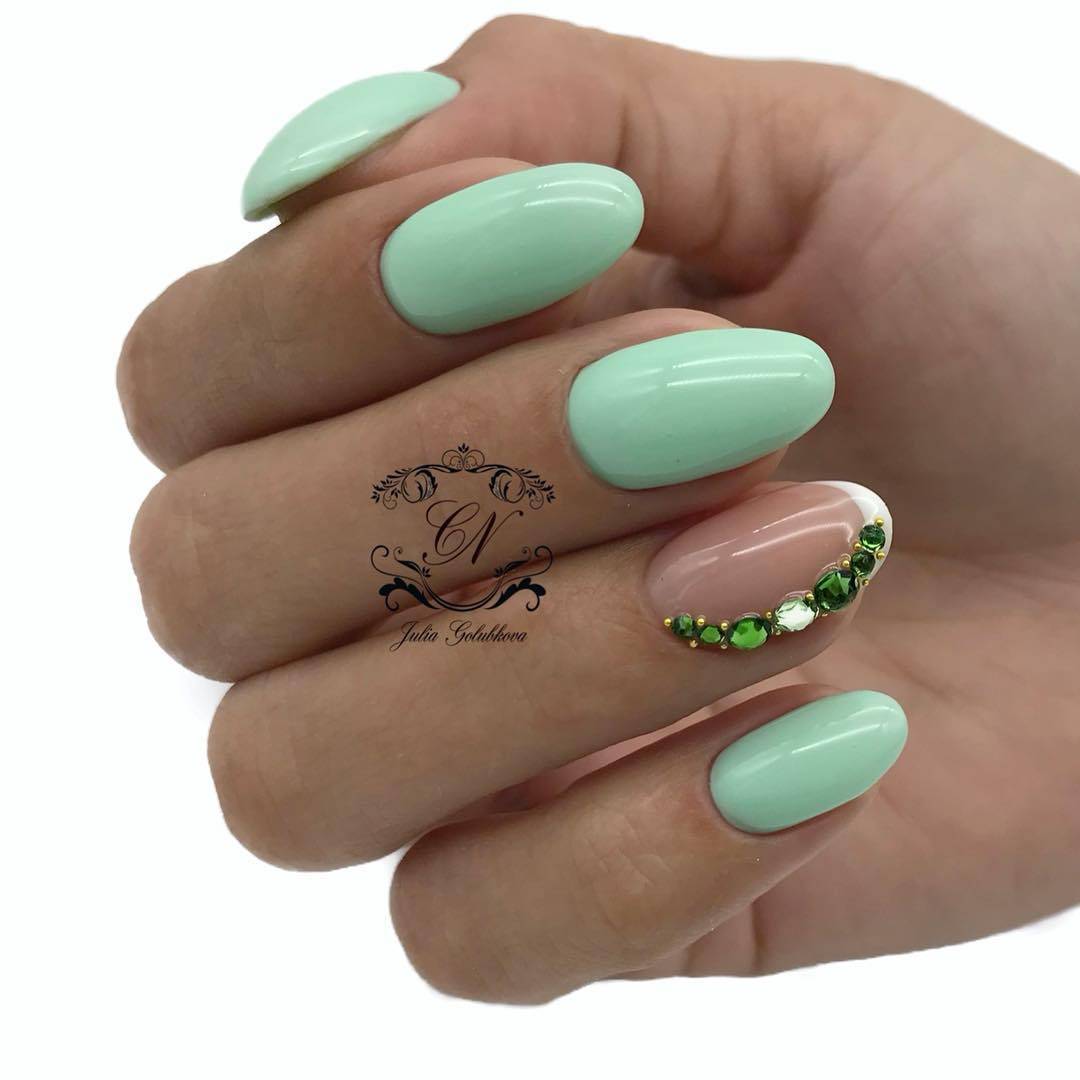 Не любите броский nail-дизайн, но так хочется украсить маникюр стразами? Одного-двух камешков в районе лунок будет достаточно и для монохромного покрытия, и для более сложного оформления. Такой вариант хорош и для коротких ногтей.