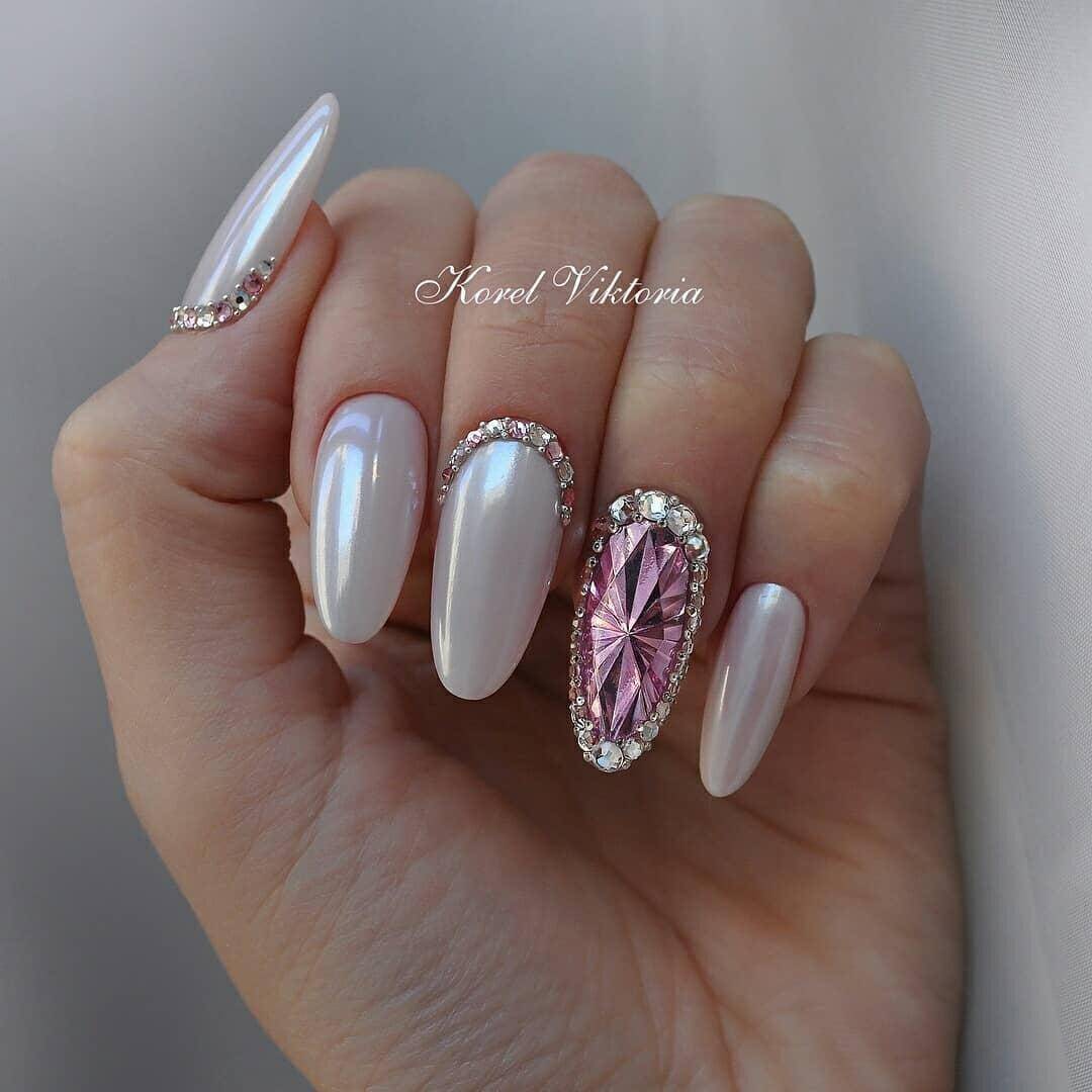 Помимо стиля минимализм популярностью пользуются нейл-арты с выкладкой композиций из стразов разного размера, бульонок, пайеток. Декор выполняется на одном из ноготков, а остальные ногти покрываются однотонным светлым оттенком гель-лака. Это позволяет компенсировать излишне яркий и объемный декор и создать сбалансированный и стильный маникюр.