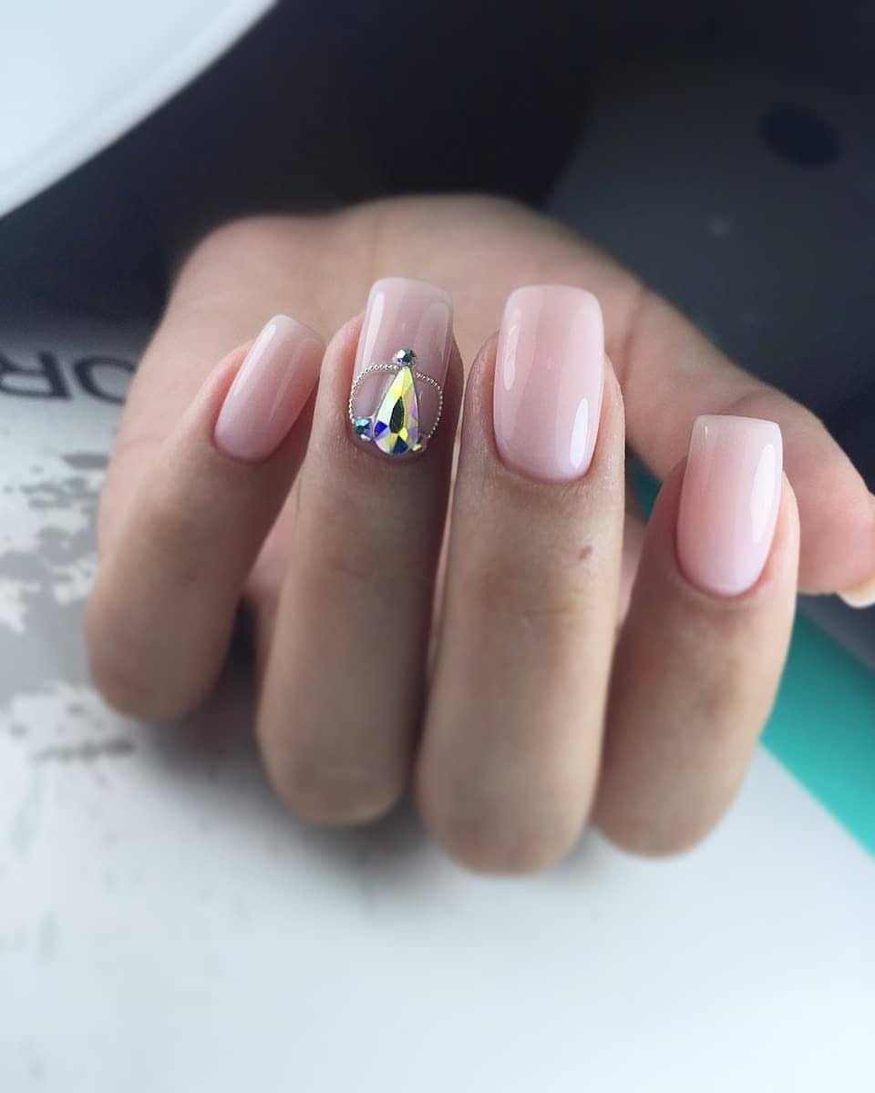 Однотонное покрытие с использованием уместного декора говорит о хорошем вкусе владелицы. На коротких ногтях лучше использовать светлый лак, который позаботится об их зрительном удлинении. Если вы выложите дорожку из страз по длине ногтя, то усилите этот эффект.