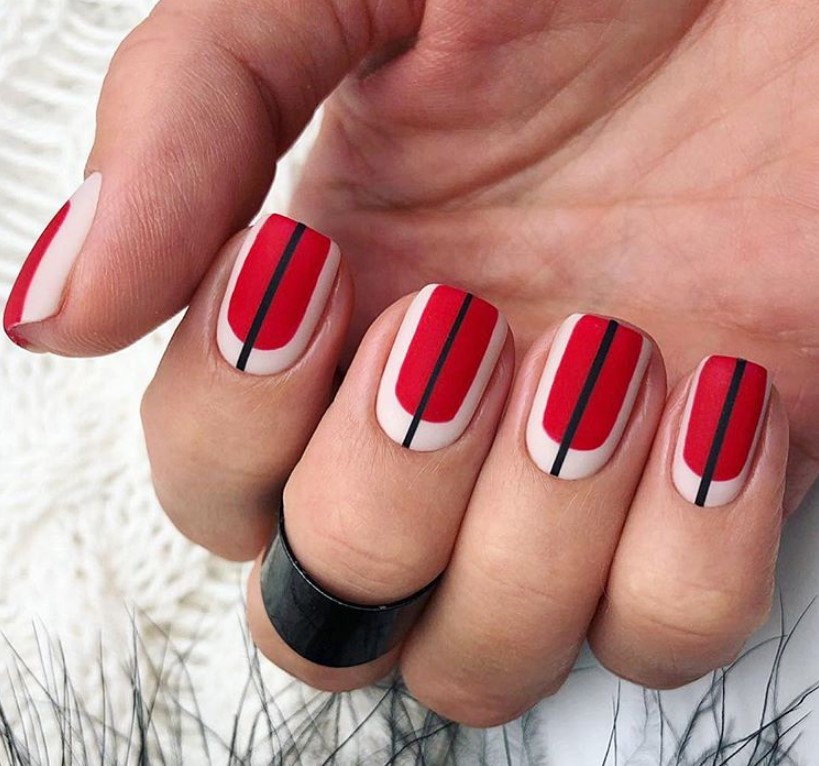 - геометрическая тематика. Оформление ногтей в геометрическом стиле позволит разнообразить однотипный бежевый или пастельный цвет. Кроме того, геометрия выбивается вперёд в трендах 2022-2023 годов и является лидирующей. Её применяют везде: в офисных и деловых, а также ярких и подростковых стилях. Оригинально смотрится геометрическое глянцевое покрытие на нюдовом основании ногтя. Это позволяет создать необычный образ, который придётся по душе каждой моднице. Плюсом такого оформления является то, что геометрию можно наносить на любую основу;
