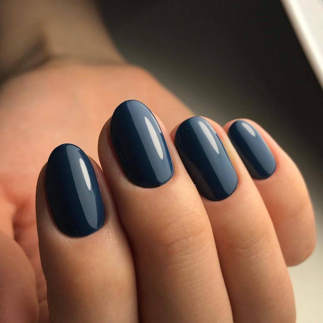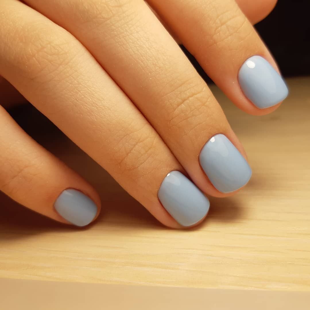 Офисный маникюр 2022 актуален также в мягких и нейтральных тонах синего (берлинская глазурь) и пыльно-серого, охры.