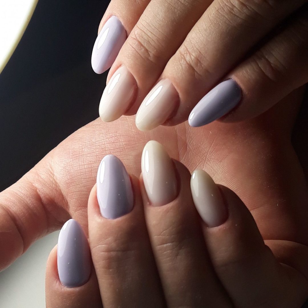 Эта техника нанесения лака, которую иначе называют градиент. Плавный переход от цвета к цвету делают на основе пастельной палитры с использованием молочной базы. Маникюр получается нежным.