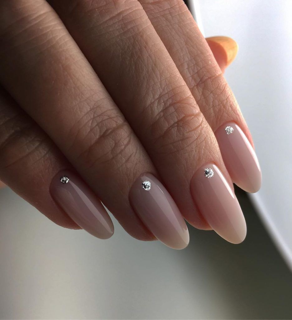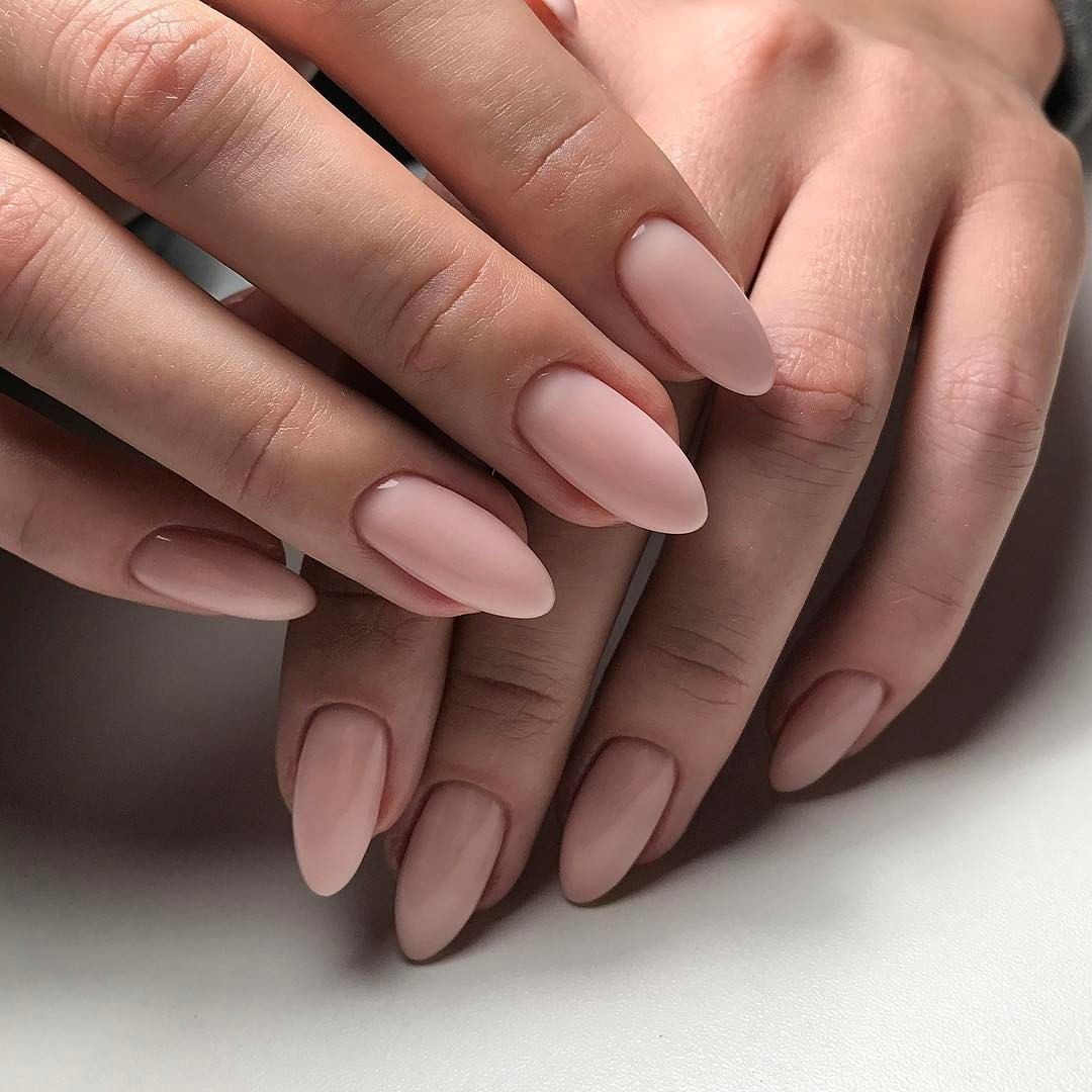 Миндалевидные ногти — само воплощение женственности и изящества. За счет вытянутой формы, такой опил зрительно удлиняет короткие пальцы, а нюдовое и прозрачное покрытие еще больше усиливают этот эффект.