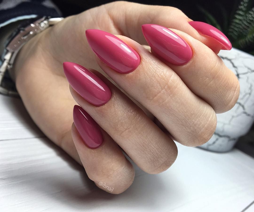 Острые ногти выбирают яркие и креативные девушки, которые не боятся привлекать внимание. Обычно, подобный длинный натуральный маникюр делается в форме стилетов, но ассоциируется с алыми и вишневыми оттенками, отсылающими к образу femme fatale